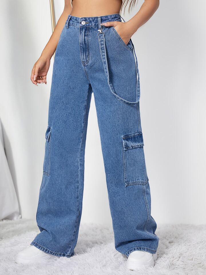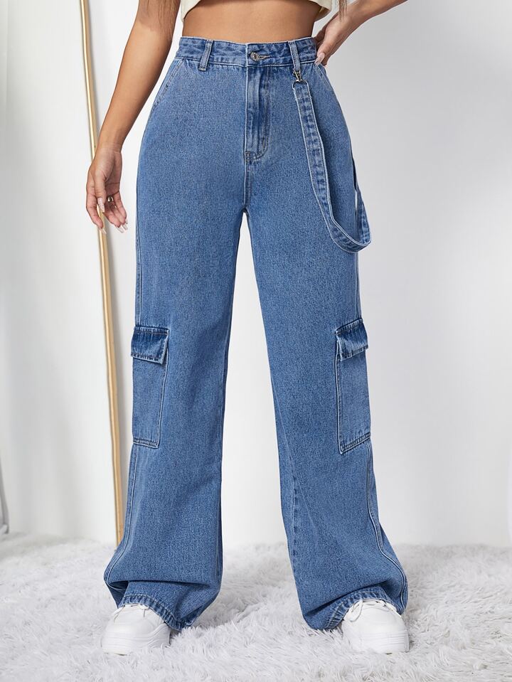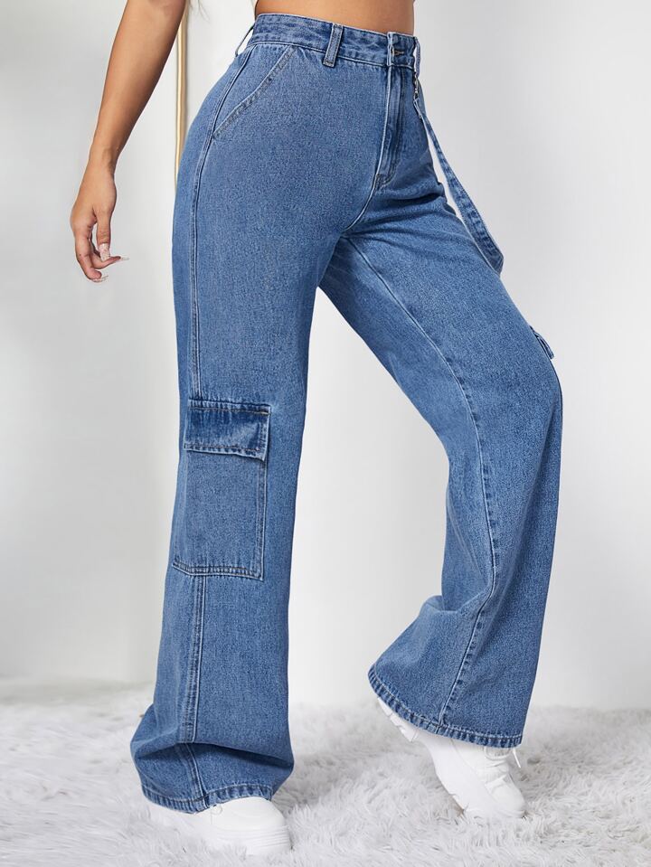 Cargo Jeans mit hoher Taille, Pattentasche & Band