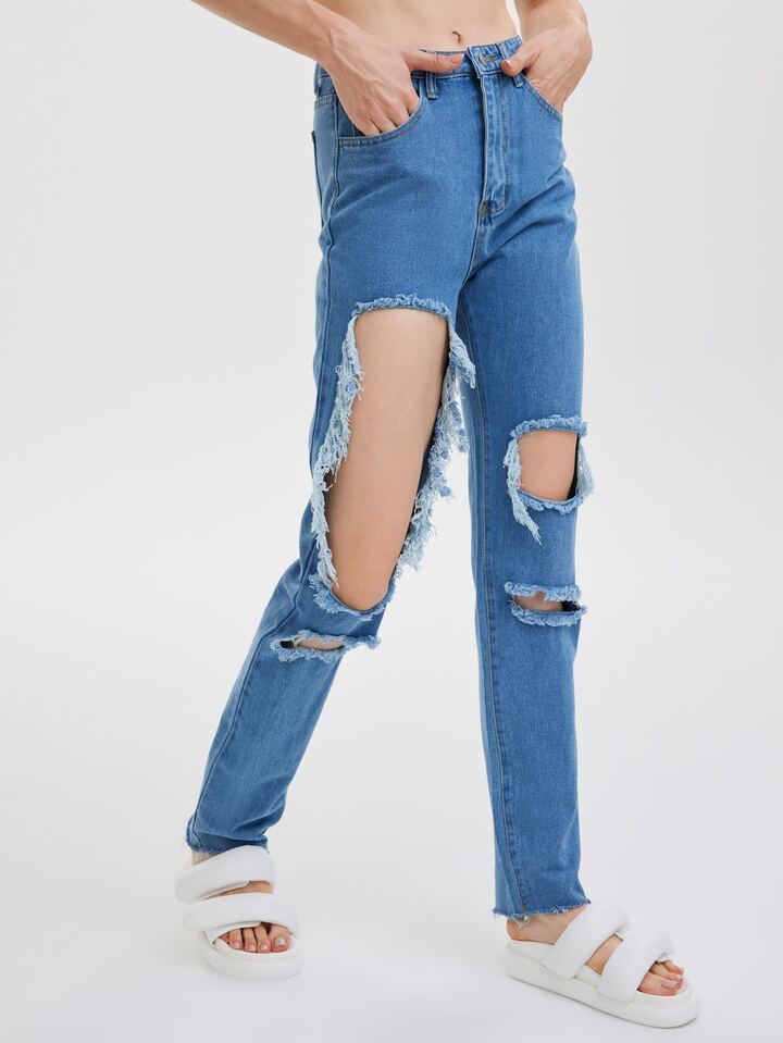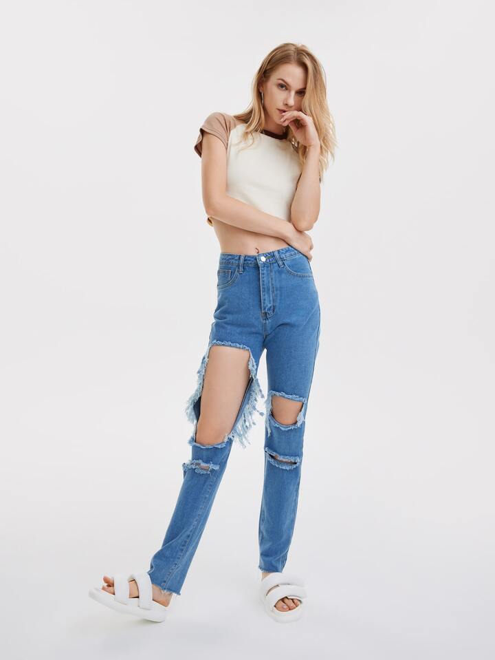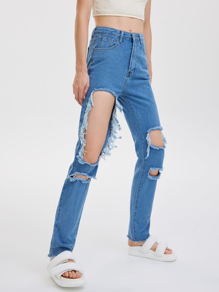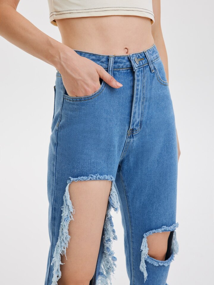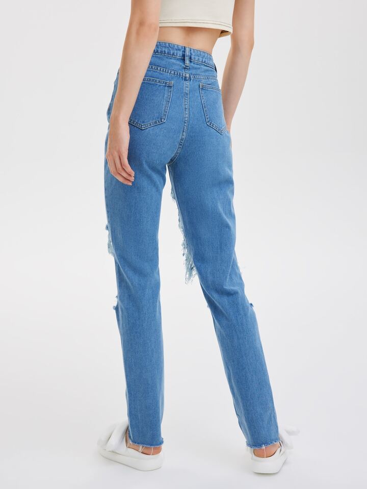 Jeans mit hoher Taille, Riss und geradem Beinschnitt