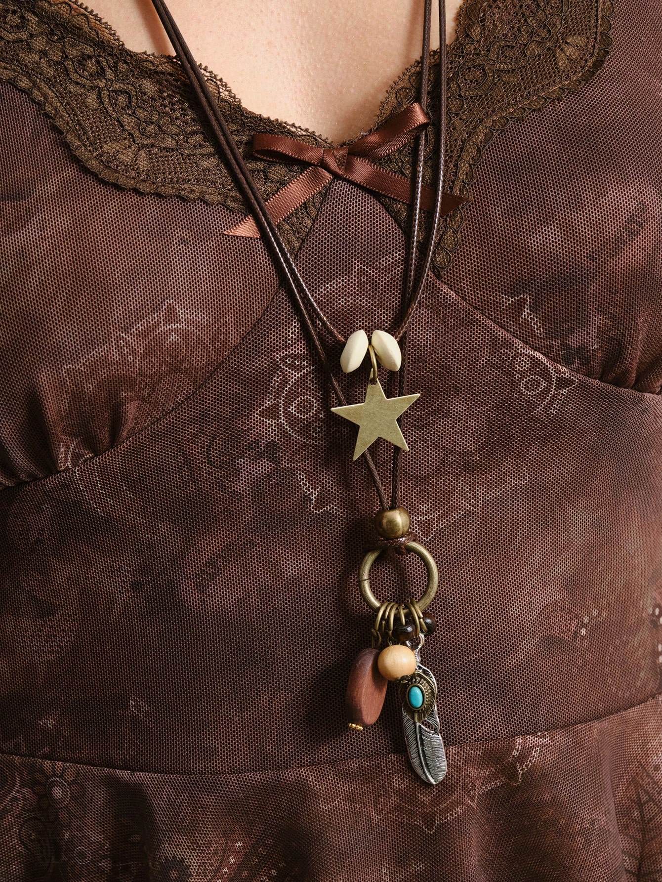Hippie 1 Stück Vintage Metall Mehrschicht-Kette mit Stern- und Blattanhänger, hochwertige Mehrschicht Pullover Kette, einzigartiges Design vielseitiges Accessoire, Boho Schmuck