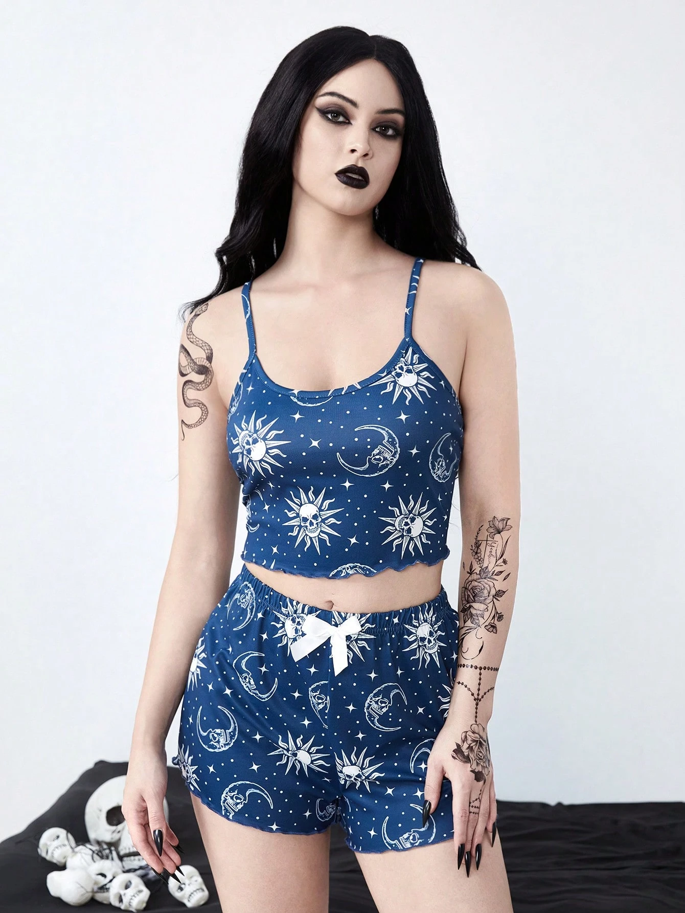 Hippie Dunkles Skelett- & Mondphasen-Druckträger-Top und Rüschen-Saum Shorts Schlafanzug Set, Lässig