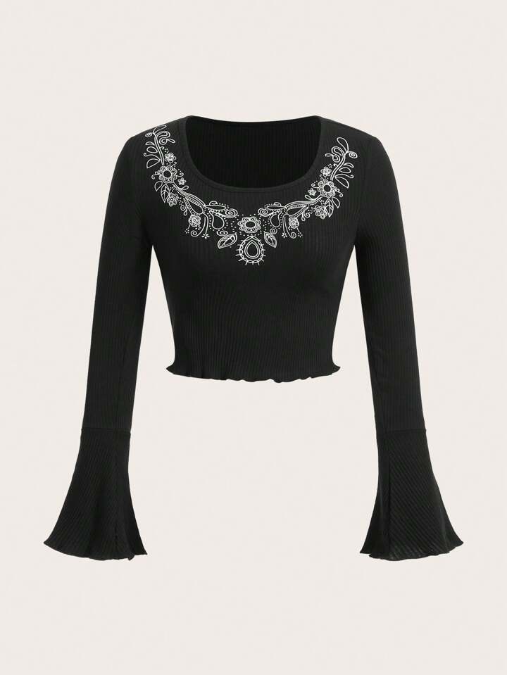 Hippie T-Shirt mit Blume Muster, Volant Ärmeln,