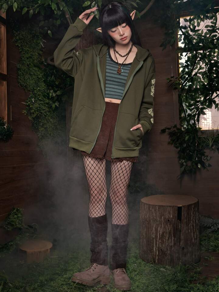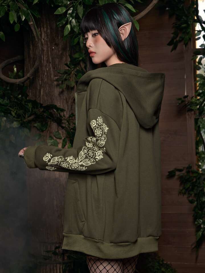Hippie Hoodie mit Blume Muster, Reißverschluss, Drop Shoulder
