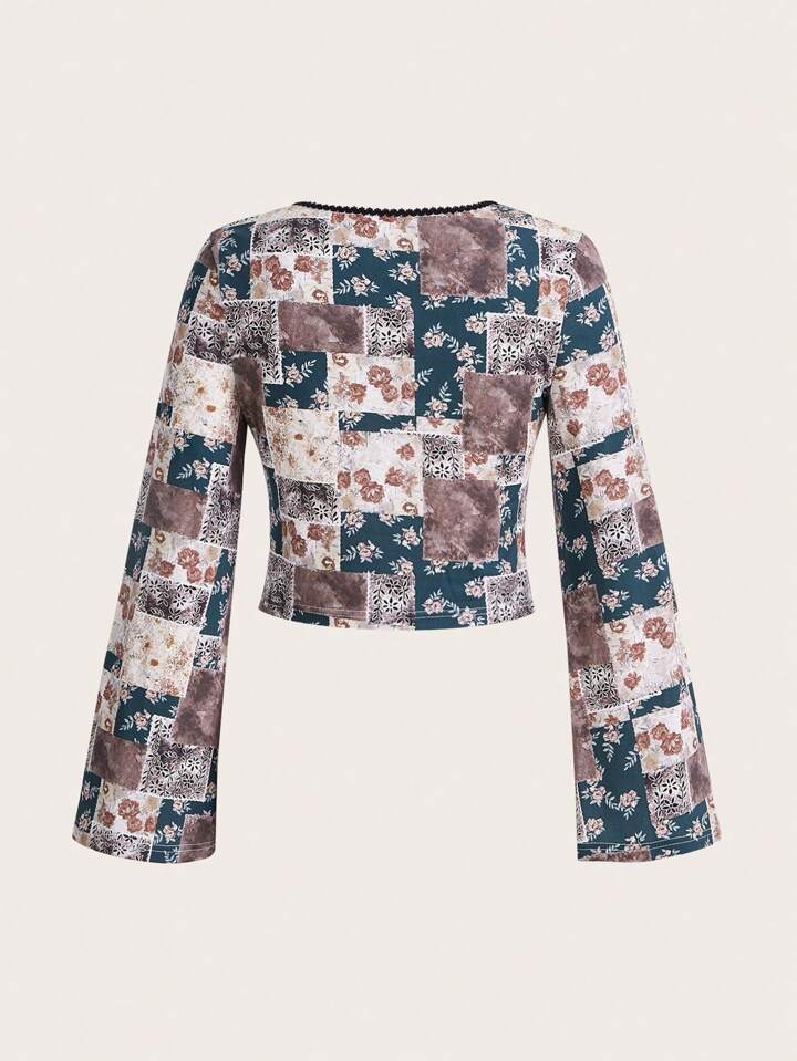 Hippie Langarm-t-shirt Mit Patchwork-print Und V-ausschnitt