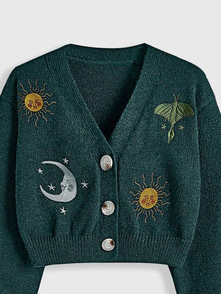 Hippie Damen Große Größen Cardigan mit Mond- und Stern-Stickerei Detail für Herbst/Winter, Langarm