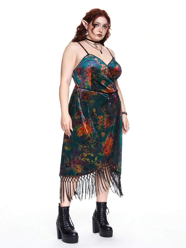 Hippie Damen Große Größen Kleid mit Blume Muster, Flickwerk und Quasten-Saum, ärmellos, für Neujahr