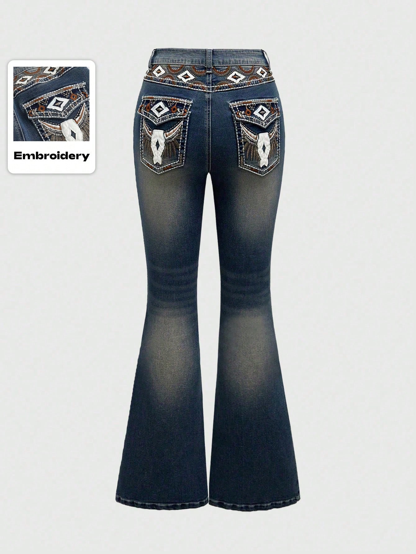Hippie Retro Washed taillierte bestickte Jeans mit Strass-Verzierung für Damen mit weitem Bein und niedriger Taille