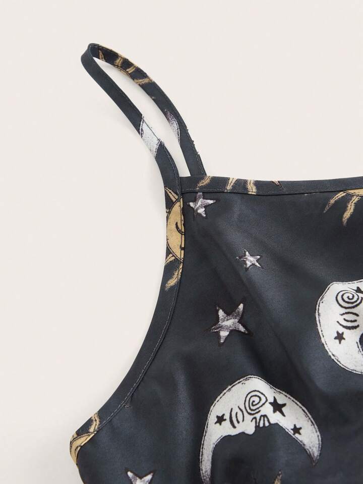Hippie Cami Kleid mit Sonne & Mond Grafik Zipfelsaum,