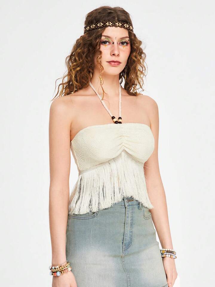 Hippie Damen Neckholder-tanktop Mit Holzperlen Und Fransen Im Bohemian-stil Für Den Urlaub