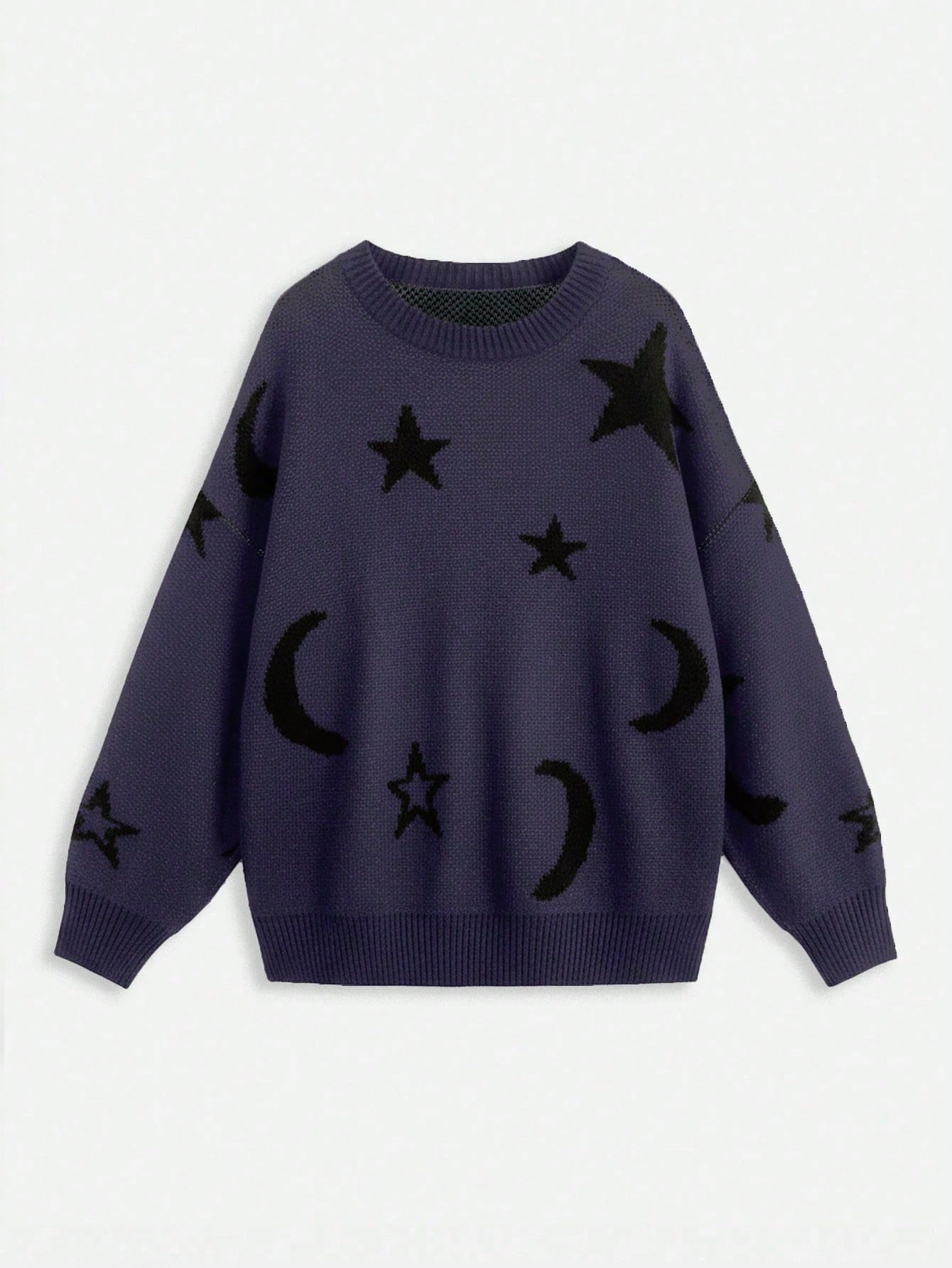 Hippie Damen Lässig Pullover mit Stern- und Mond-Muster, Herbst/Winter