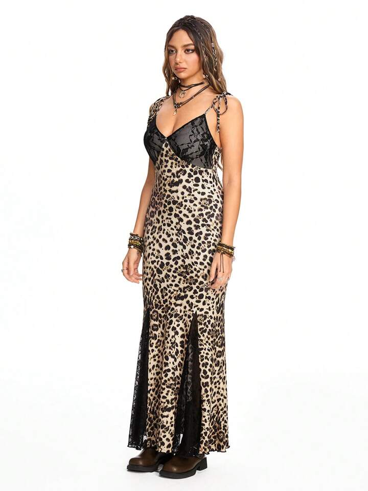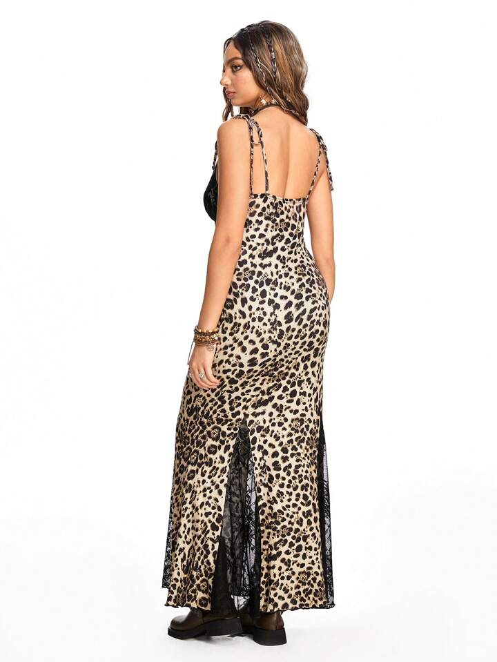 Hippie Damen langes Kleid mit Leoparden Muster und kontrastfarbener Spitze