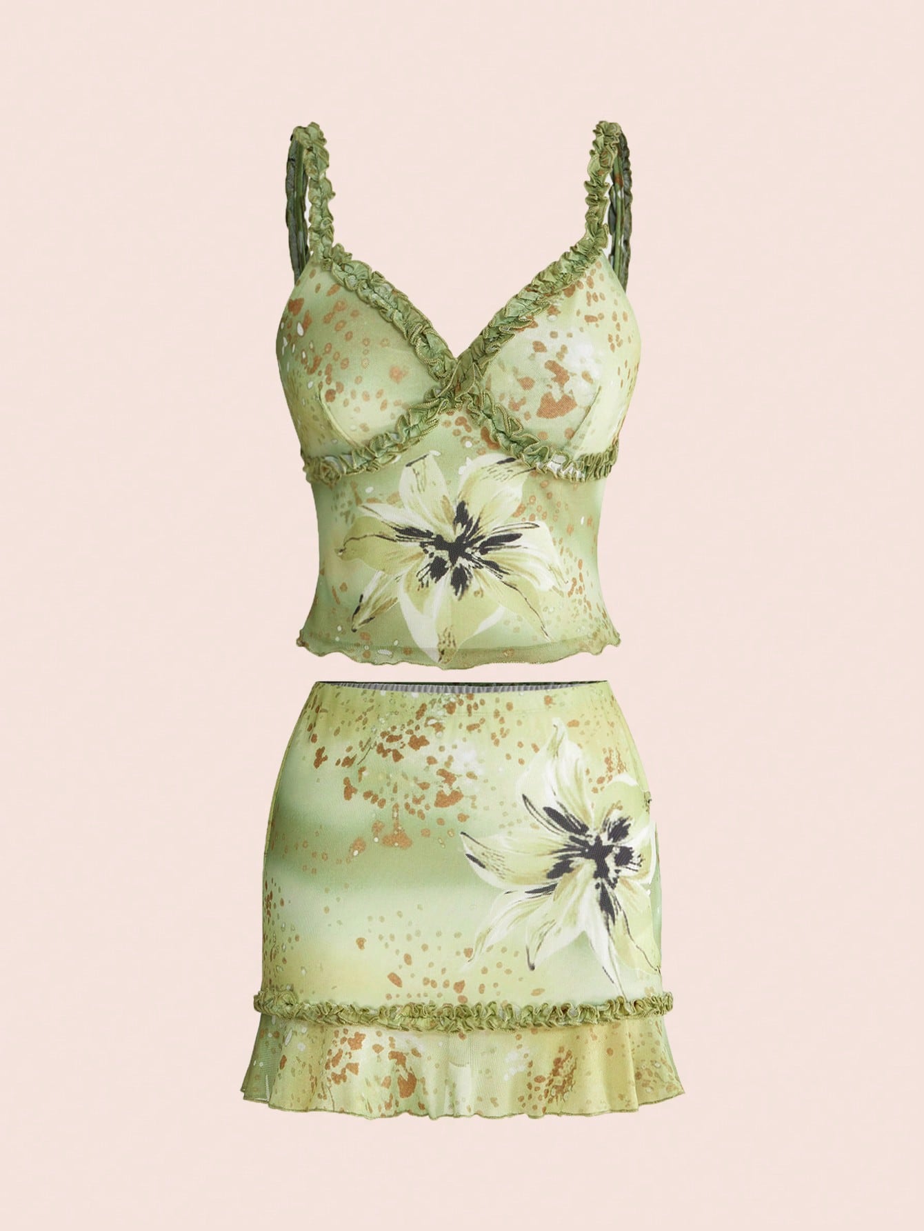 Insel-Urlaubs-Chic Blume Muster Rüschen-Saum Trägerhemd kombiniert mit Mini-Rock, Damen 2-teiliges Set