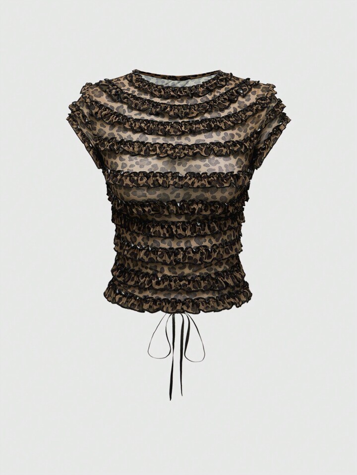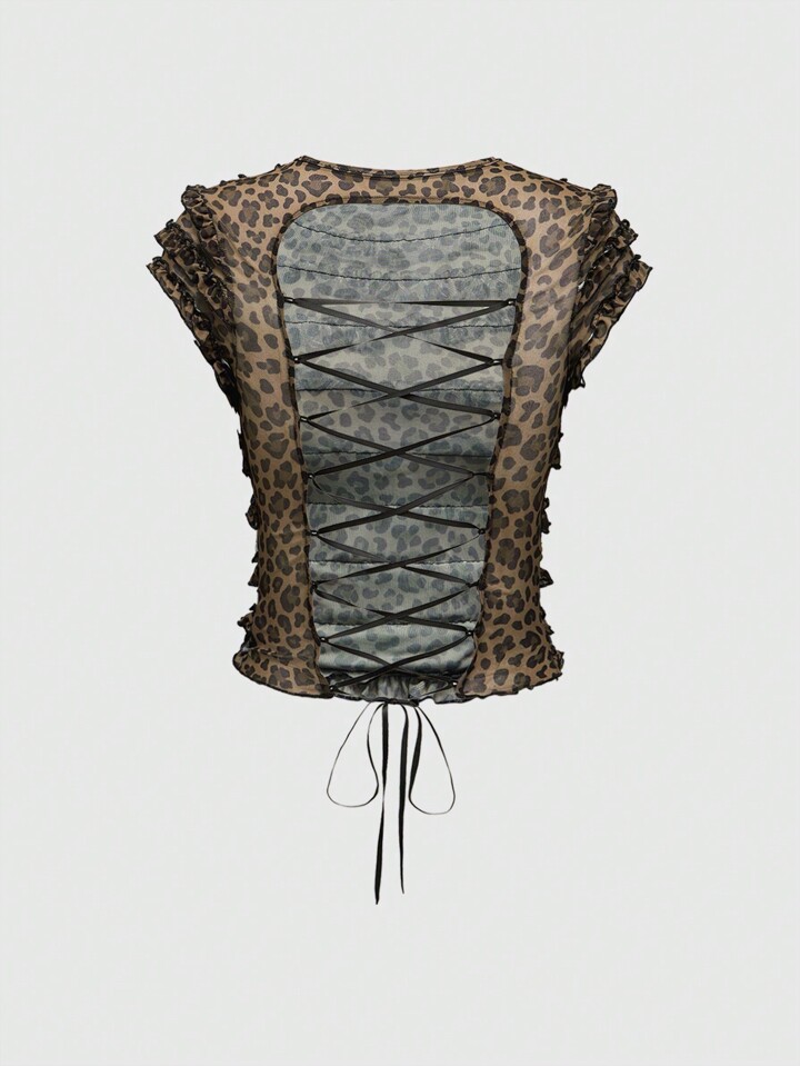J-Fashion 2 Stücke Y2K Sexy Damen Set: Netzrückenfreier Bodycon Leopard Muster Volant Shorts