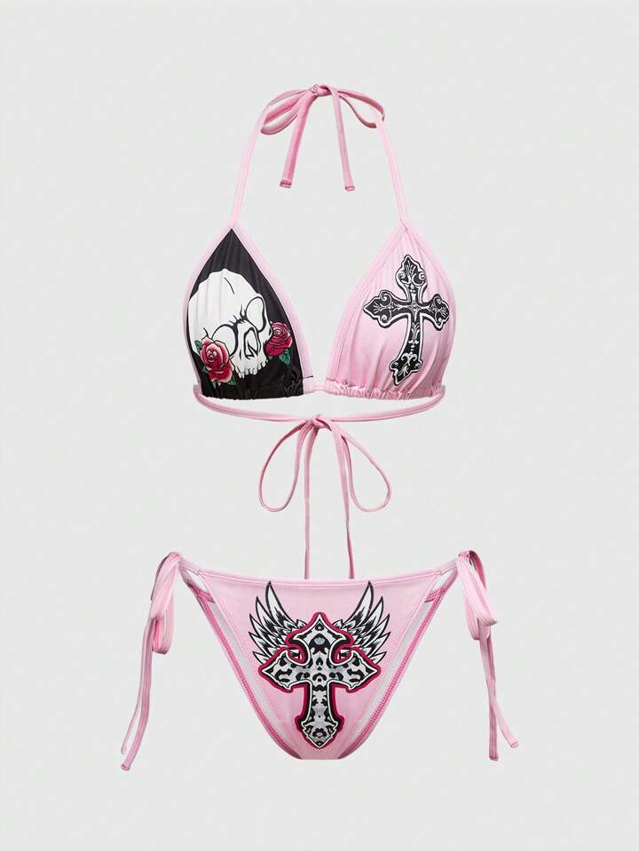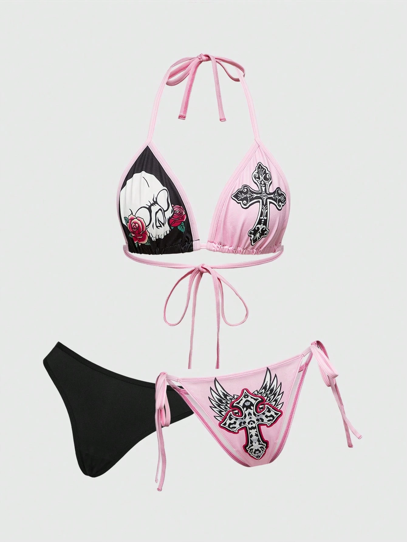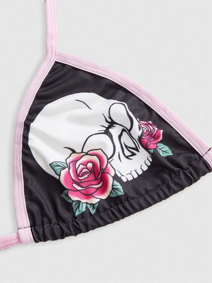 J-Fashion 3 Stücke Y2K Goth Rose Totenkopf Farbblocking Bikini Set, drahtloser sexy Spitzen-Damen Dessous Set