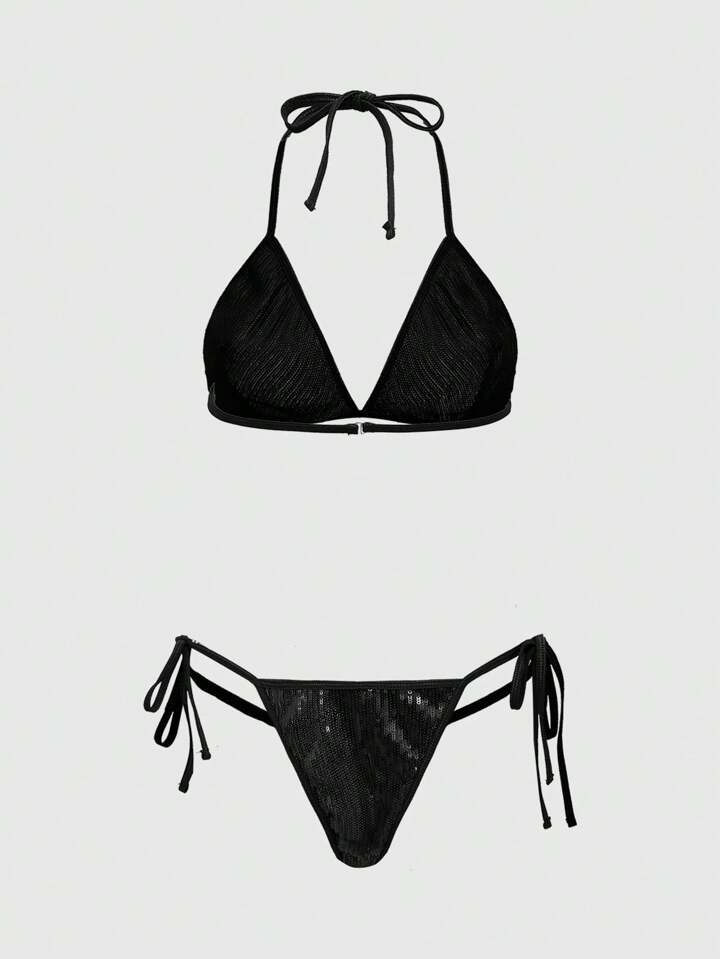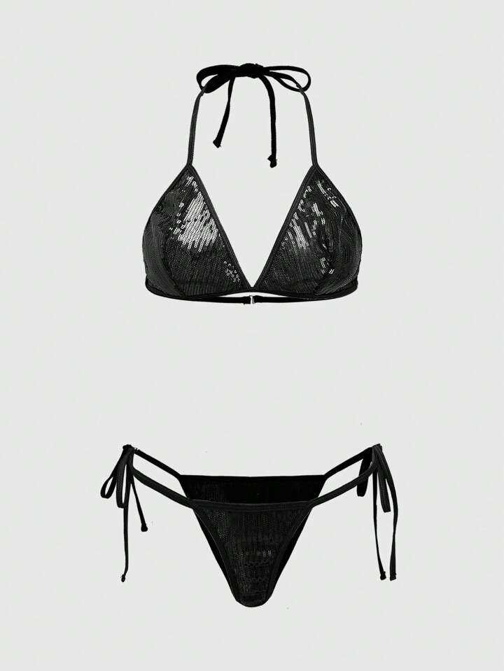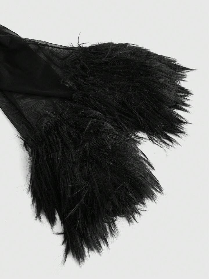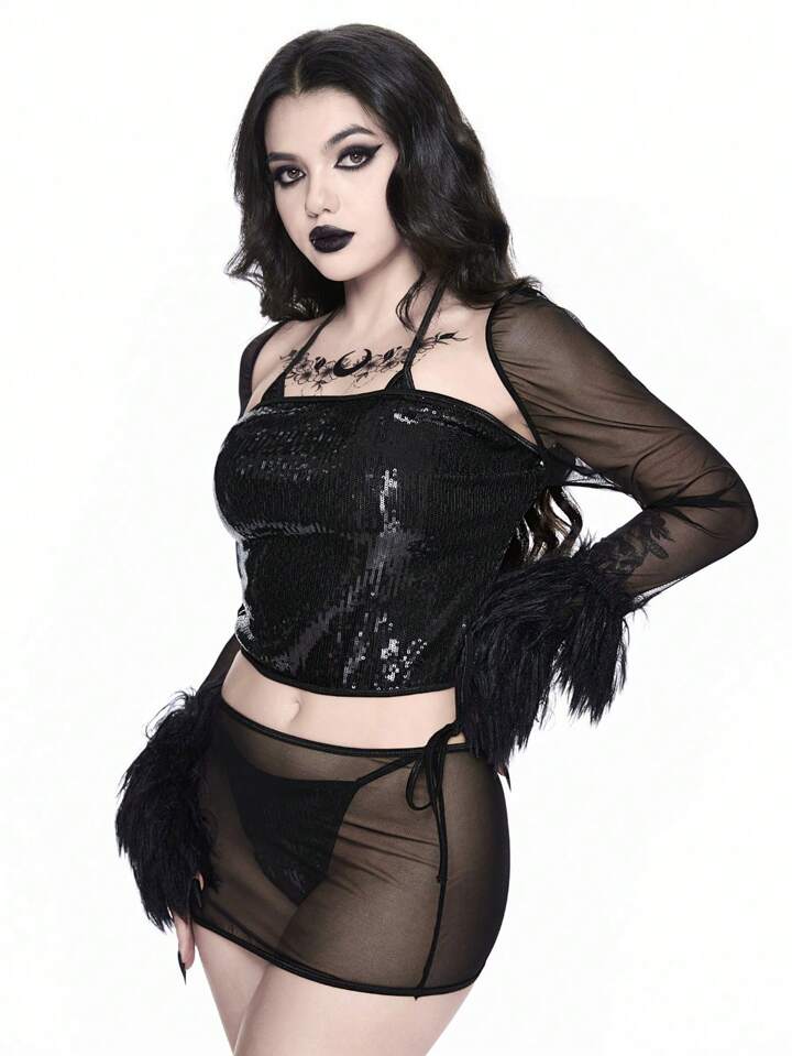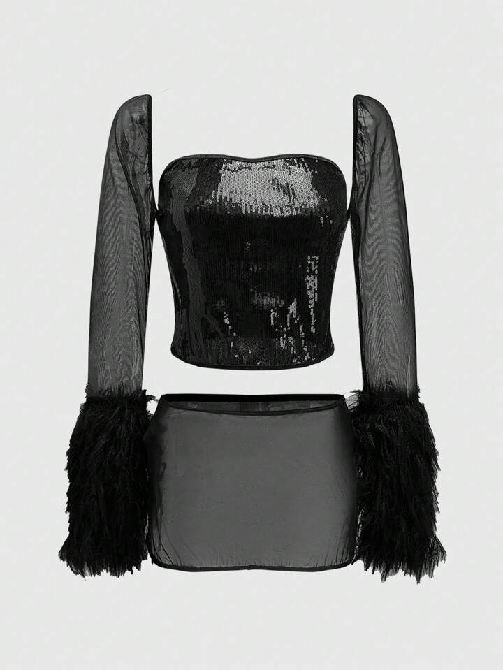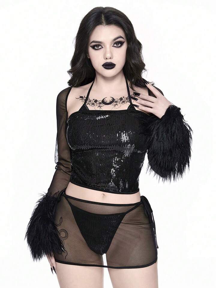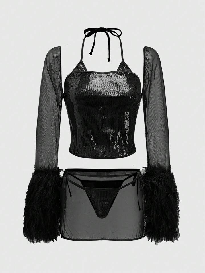 J-Fashion 4 Stücke Glitzer Schnür-BH, Pelz-Manschette Langarm transparente sexy Dessous Set