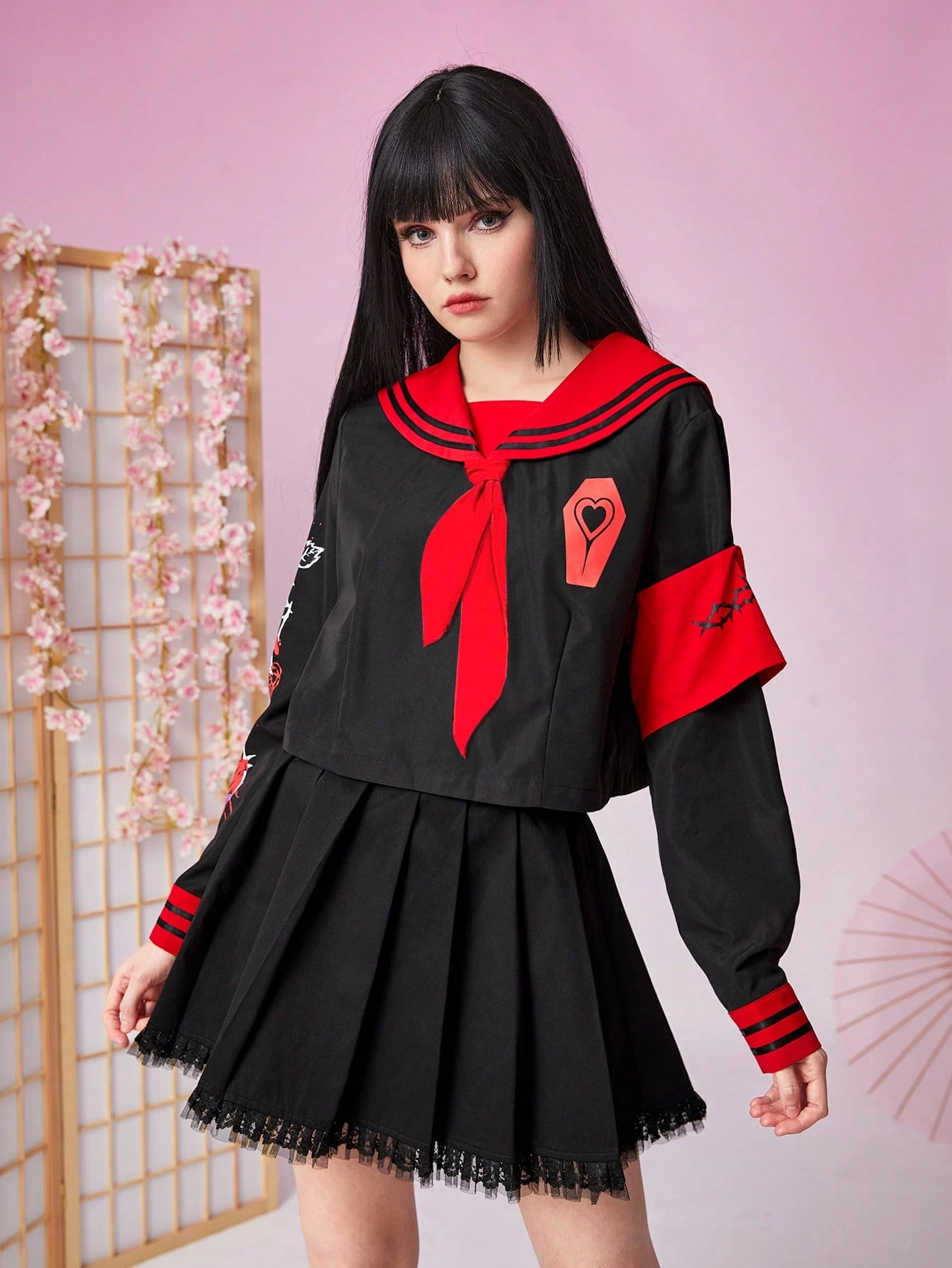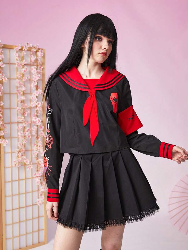 J-Fashion Bluse mit Blume & Herzen Grafik Seemannskragen,