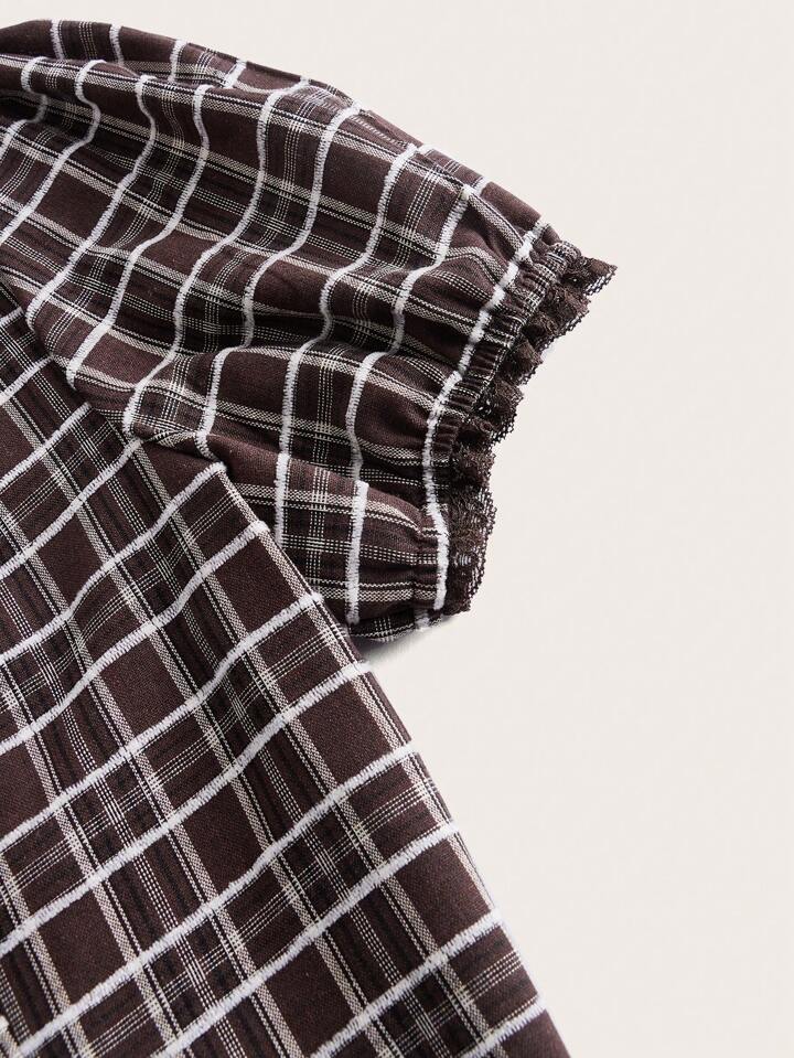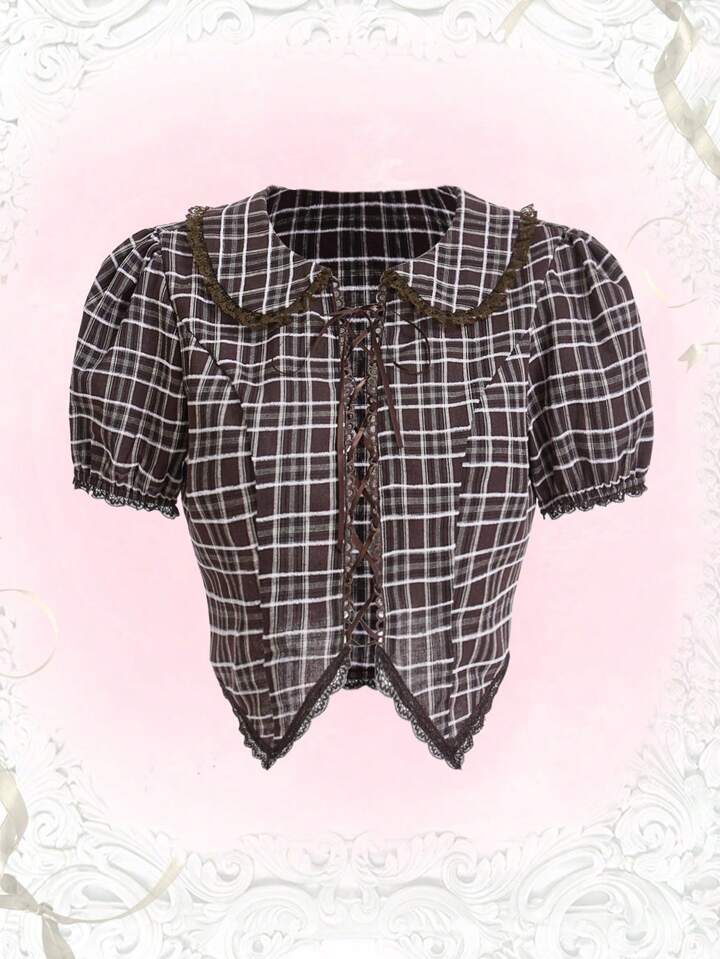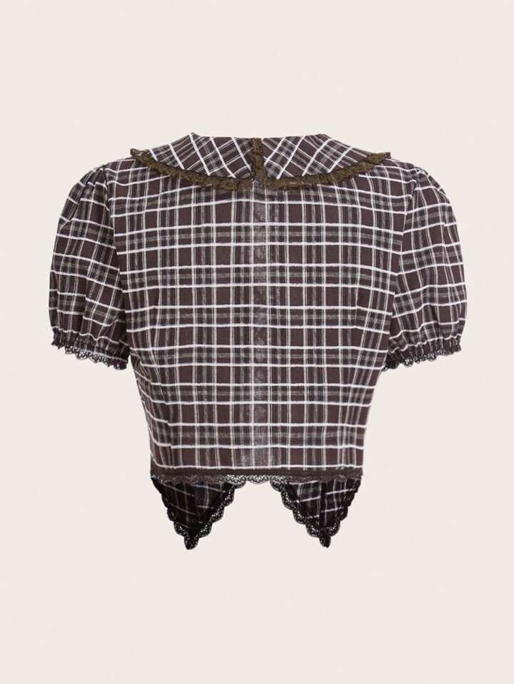 J-Fashion Bluse mit Plaid Muster, Puffärmeln, asymmetrischem Saum,
