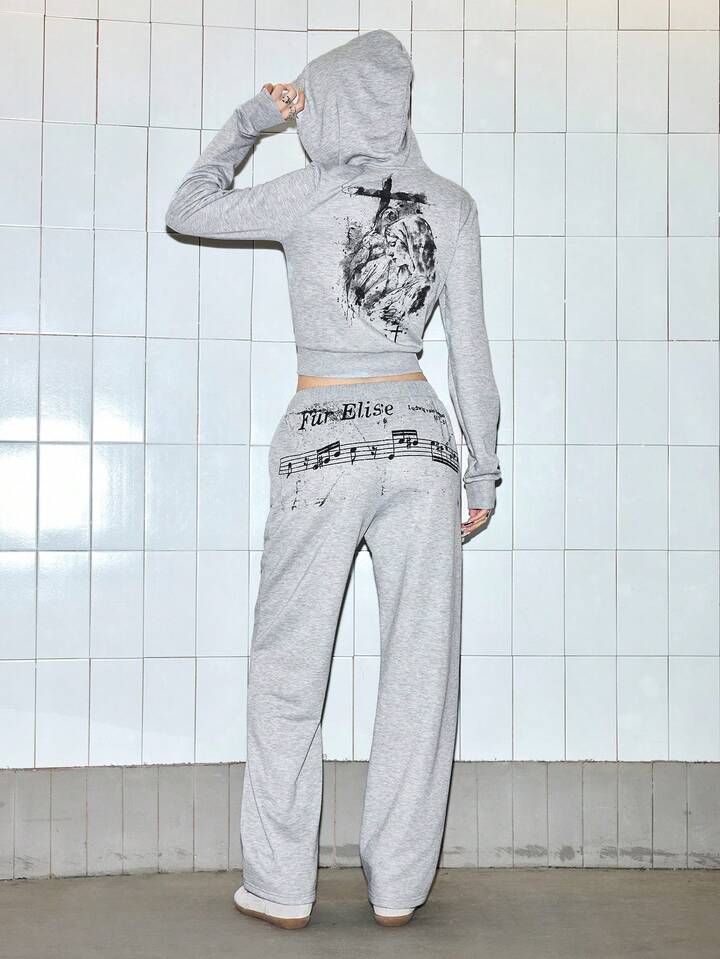 J-Fashion Retro Musiknoten-Muster Crop Hoodie Set, amerikanischer Stil