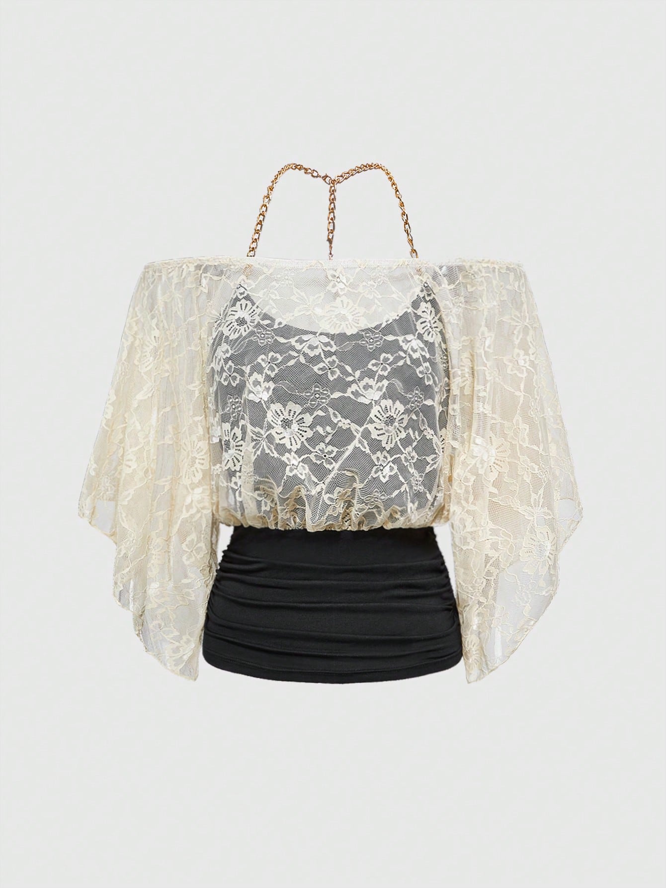 J-Fashion Shibuya Gyaru asymmetrische Halskette & Fledermausärmel T-Shirt mit Spitze für Damen