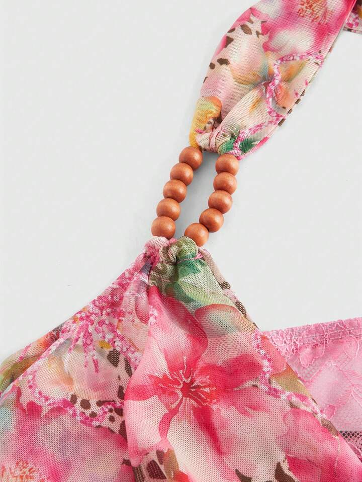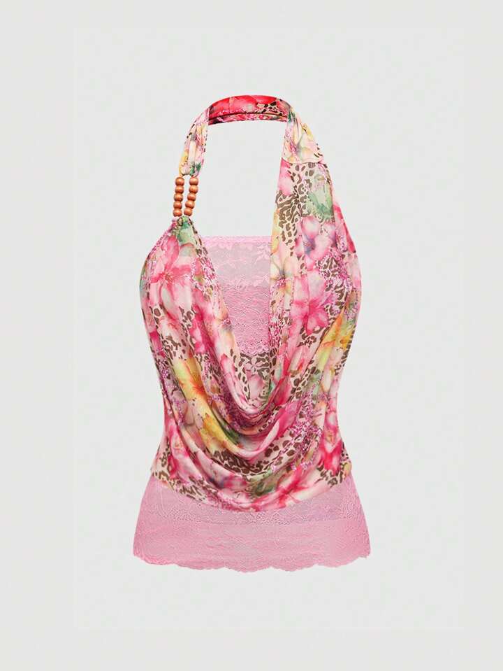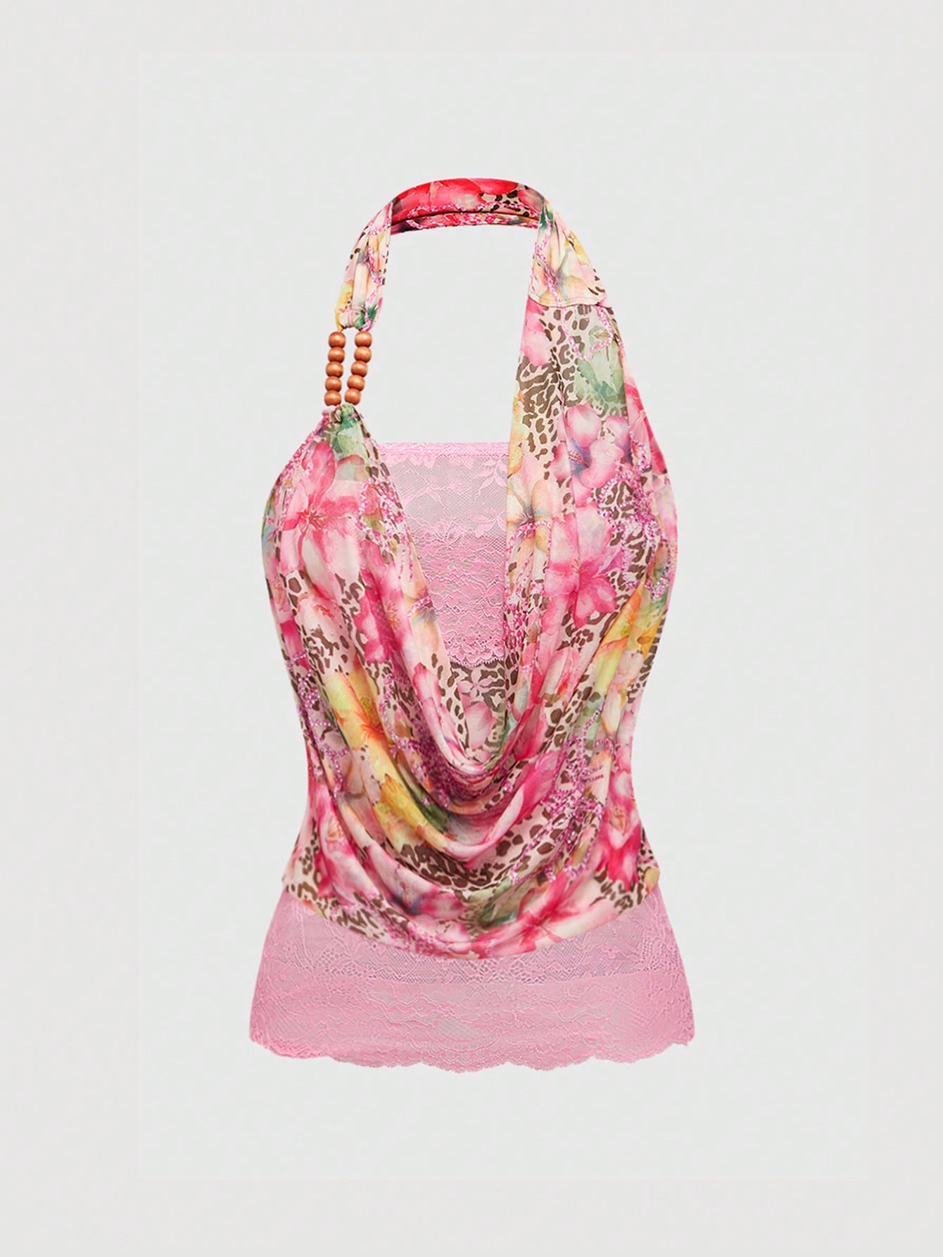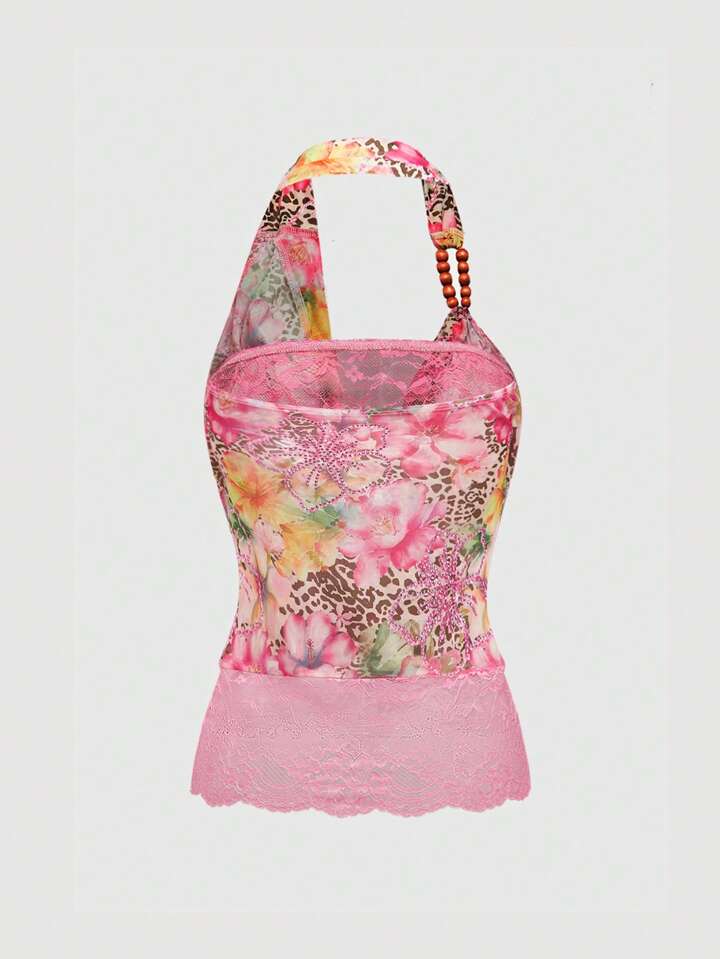 J-Fashion Sommer Hawaii Urlaub Y2K Blume Muster 2-in-1 Spitze Neckholder geripptes Crop Top