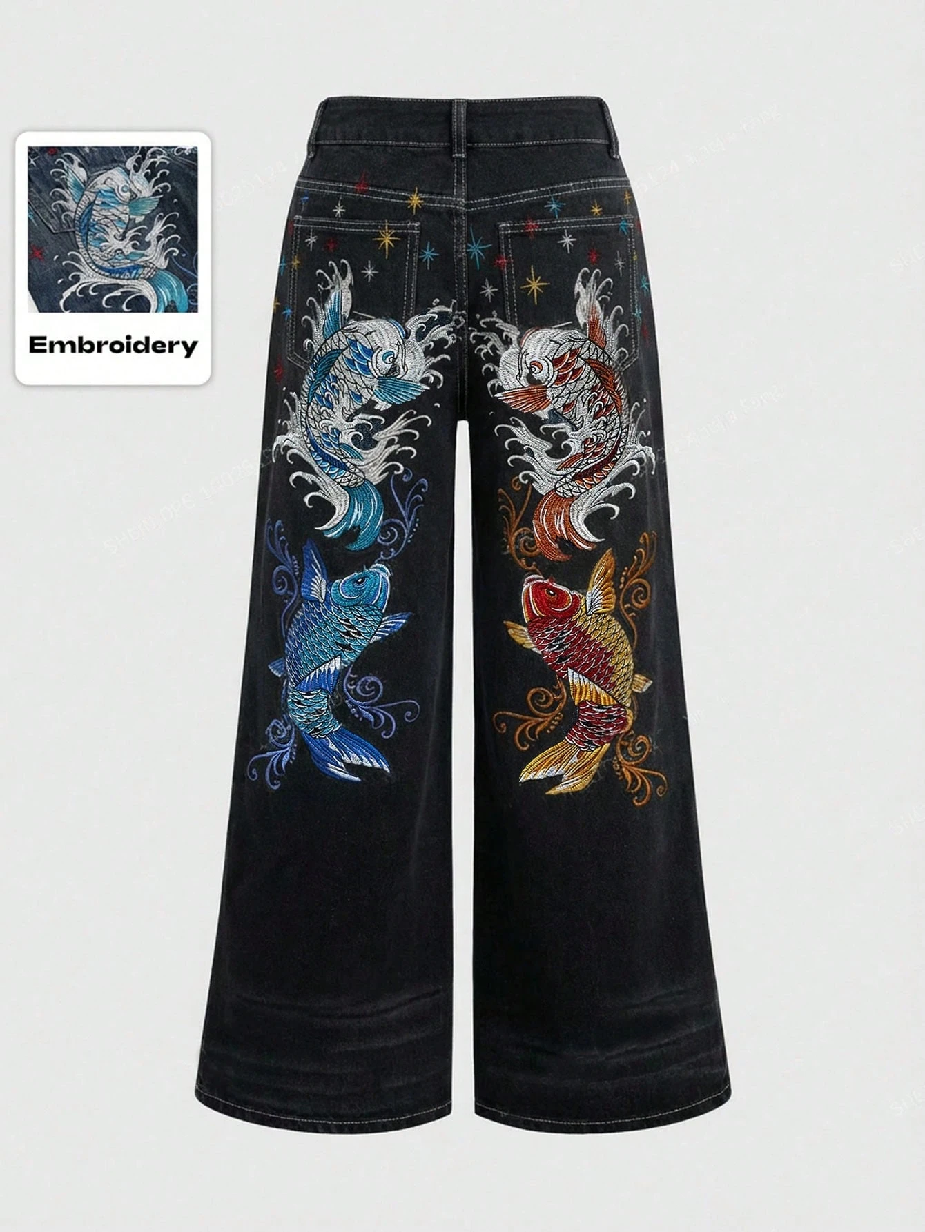 J-Fashion Unisex Retro Hip Hop Subkultur Karpfen Blumen Stickerei Weite Schlupfhose