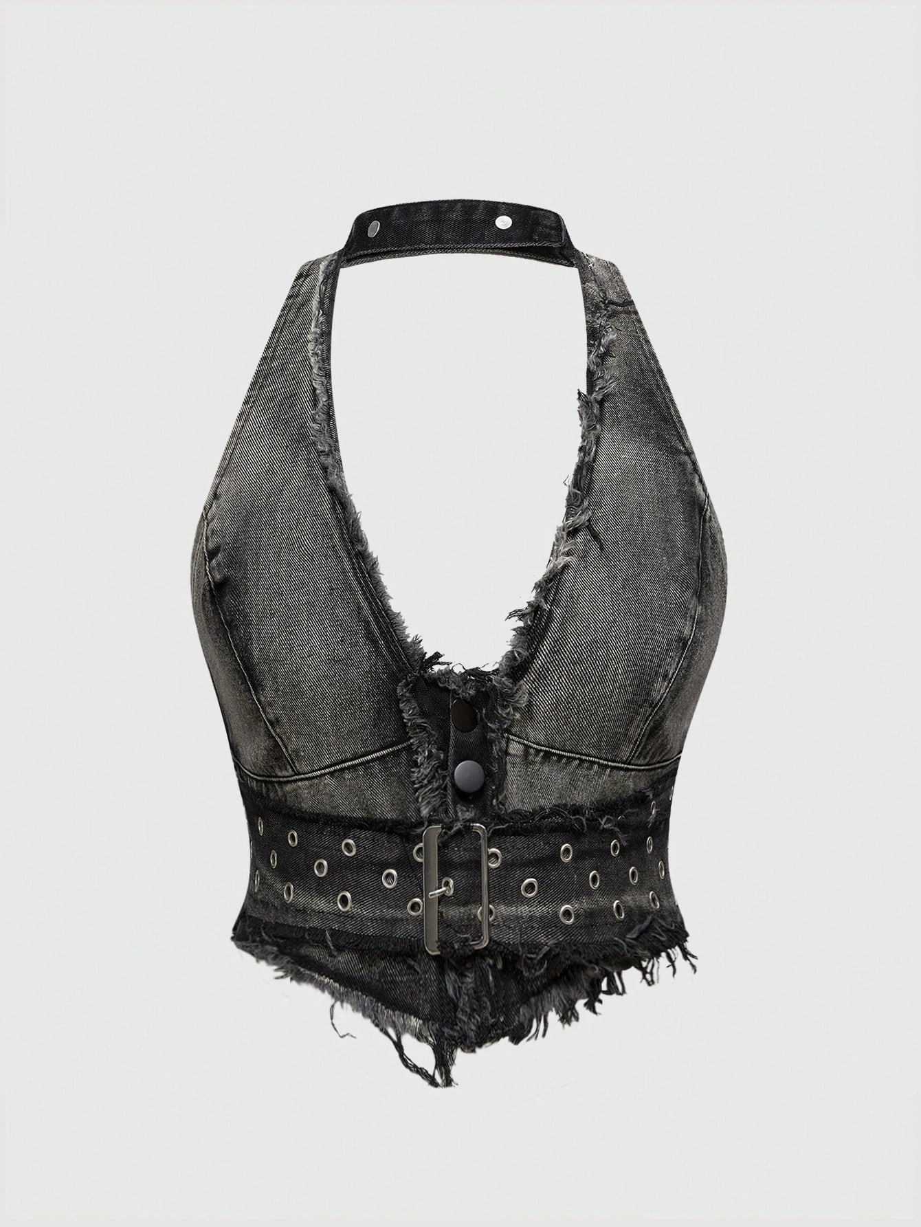 J-Fashion Vintage gewaschene Denim-Bluse mit V-Ausschnitt und Quasten, figurbetont