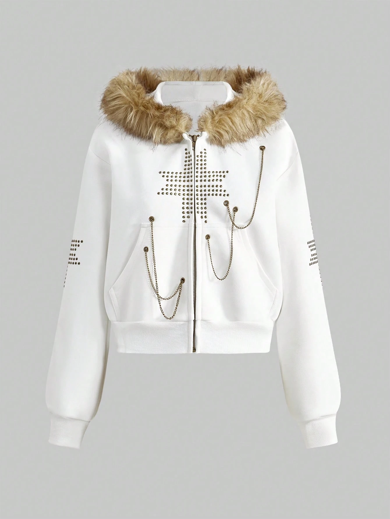 J-Fashion Damen Retro Punk Nieten Ösen Kette Fellimitat Patchwork Kapuzenpullover