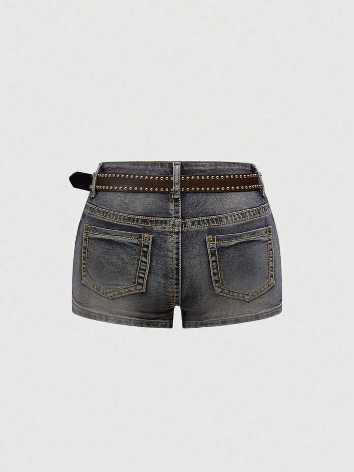 J-Fashion Damen Y2K Harajuku Hot Girl Kristallschädel & Stern Fransensaum Denim Shorts (mit Gürtel)