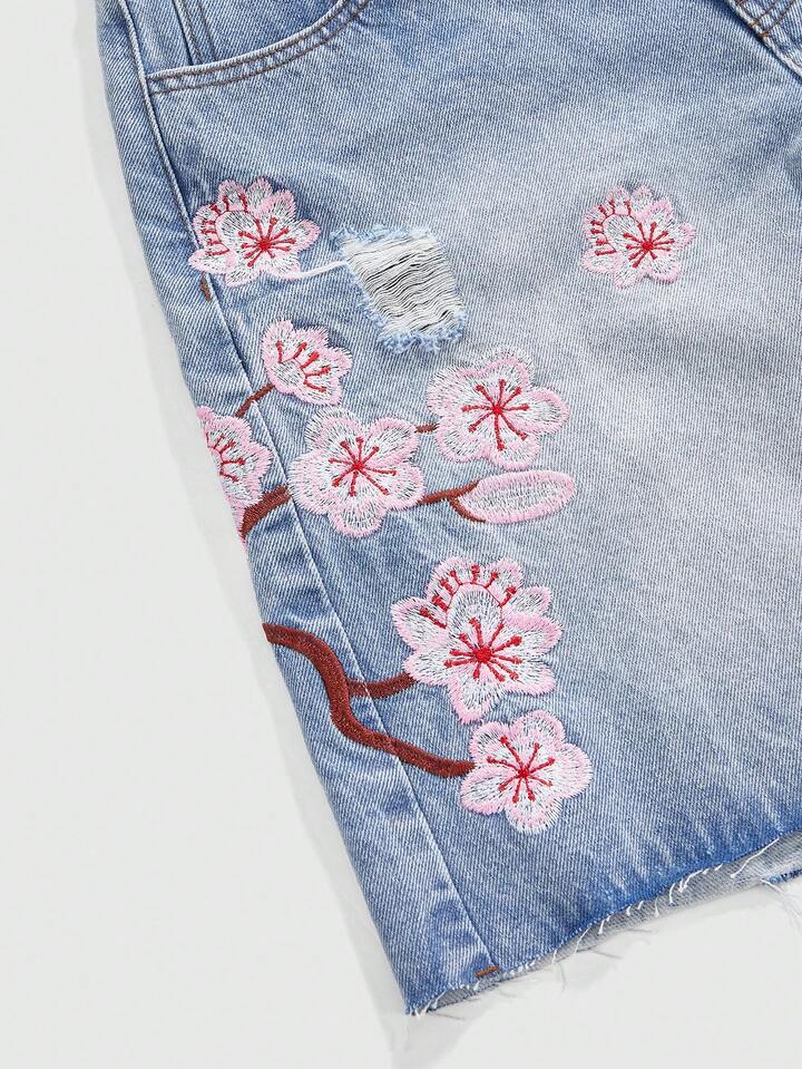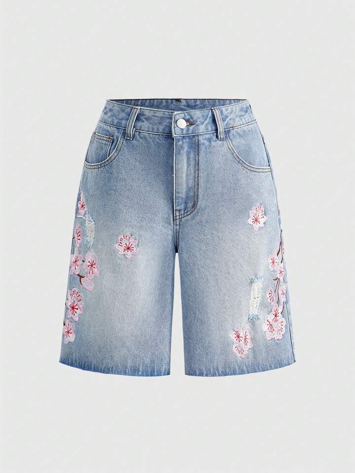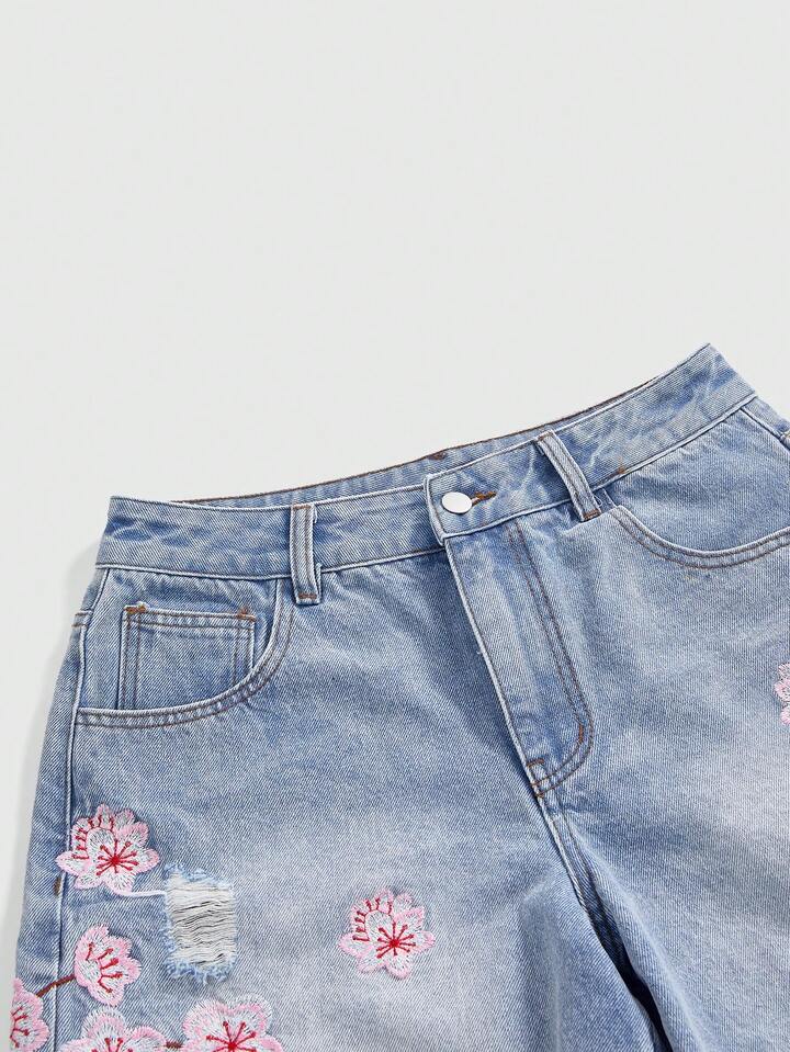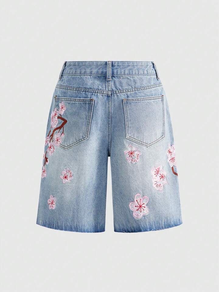 J-Fashion Damen Y2K Retro Subkultur Kirschblüten bestickte locker sitzende Crop Super Tief Taillierte Jeans Shorts, Unisex