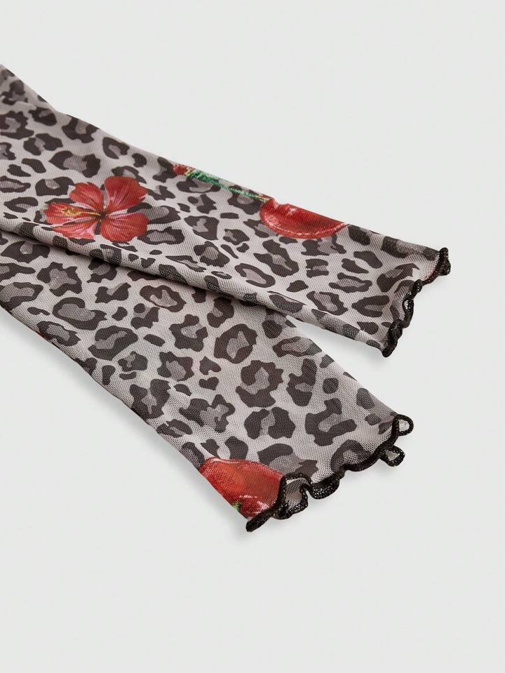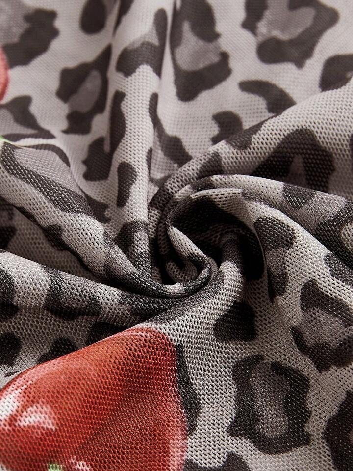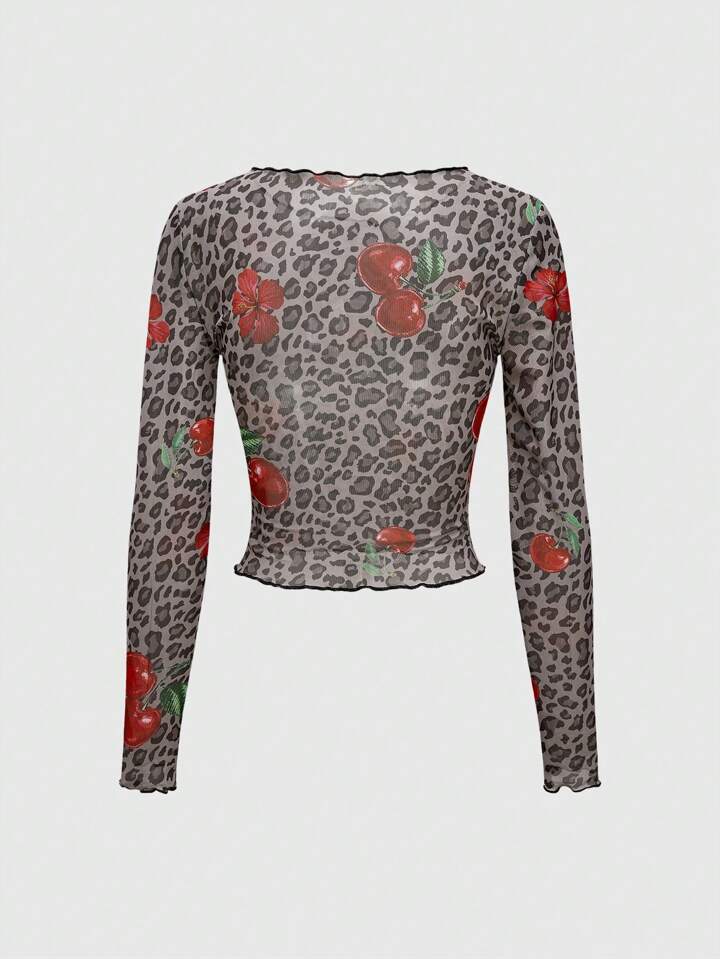 J-Fashion Damen Y2K Subkultur sexy Leopardenmuster Kirsche Grafik transparente Bluse