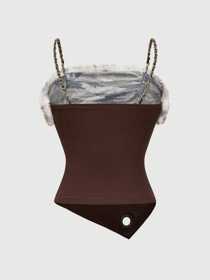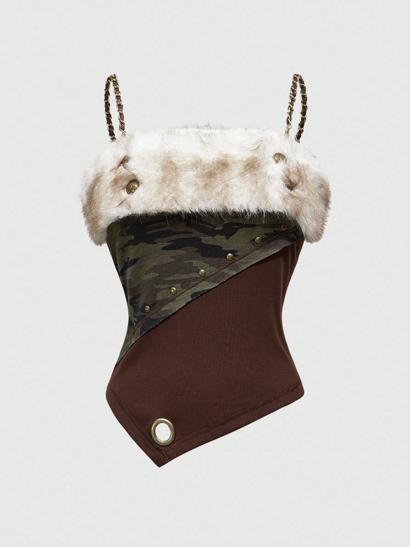J-Fashion Y2K Gyaru Himekaji Kunstpelz Patchwork Camouflage Muster Flauschiges Ketten-Verziertes Damen Top, Herbst/Winter