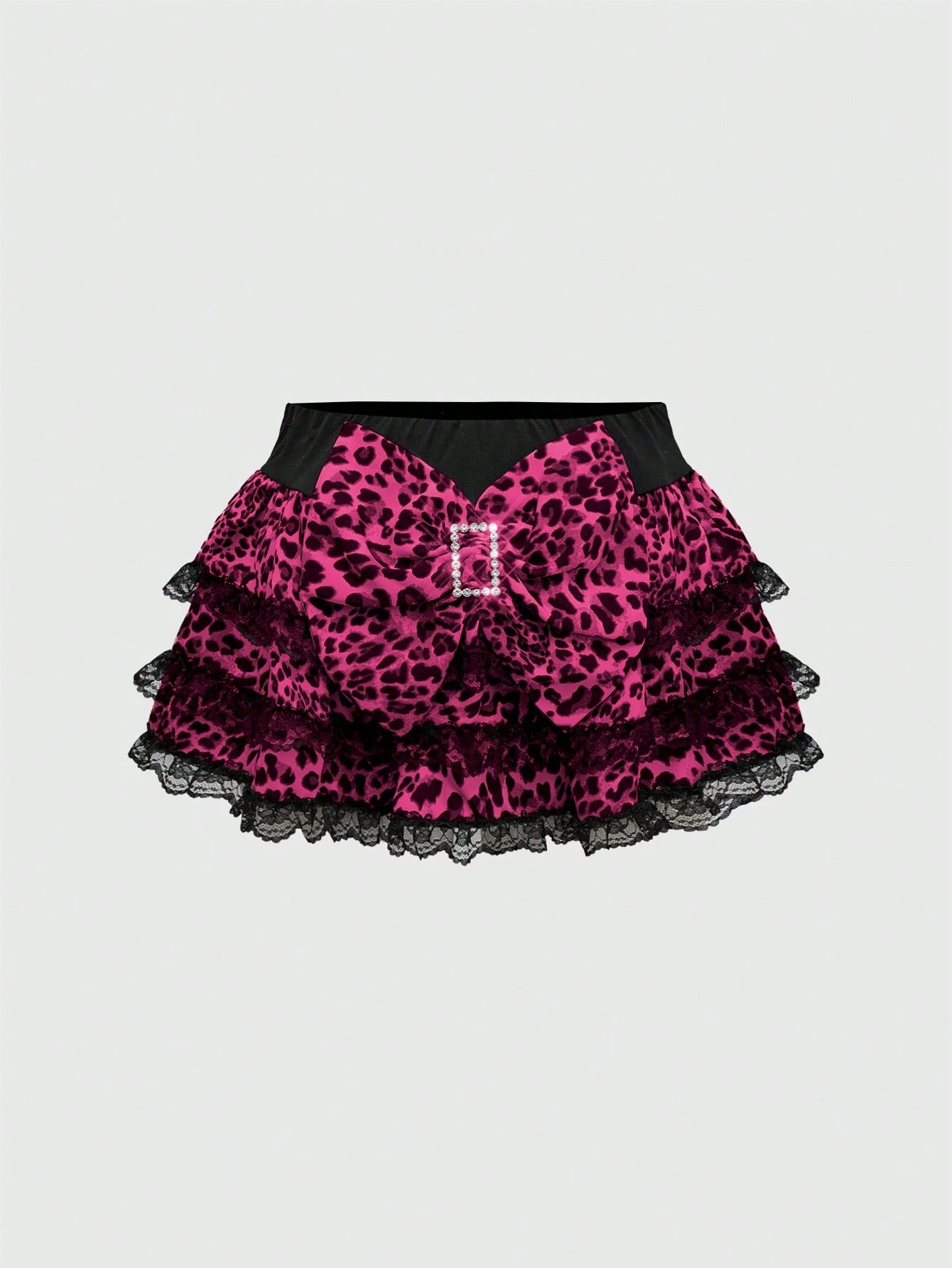 J-Fashion Y2K Harajuku Babe extrem großer Schleife tiefsitzender Spitzen-Rüschen Leoparden-Muster-Rock für Frauen