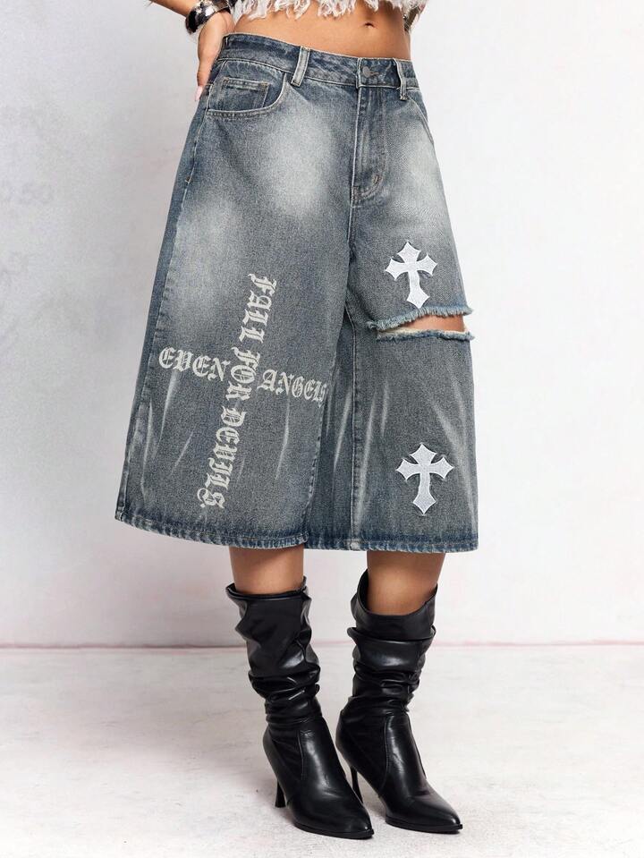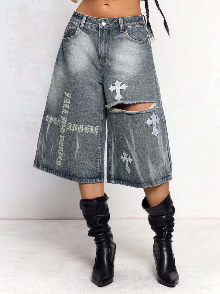 J-Fashion Y2K Punk Street Kreuz Stickerei & Buchstaben Muster Loose Taillenbund 7/8 Länge Jeans