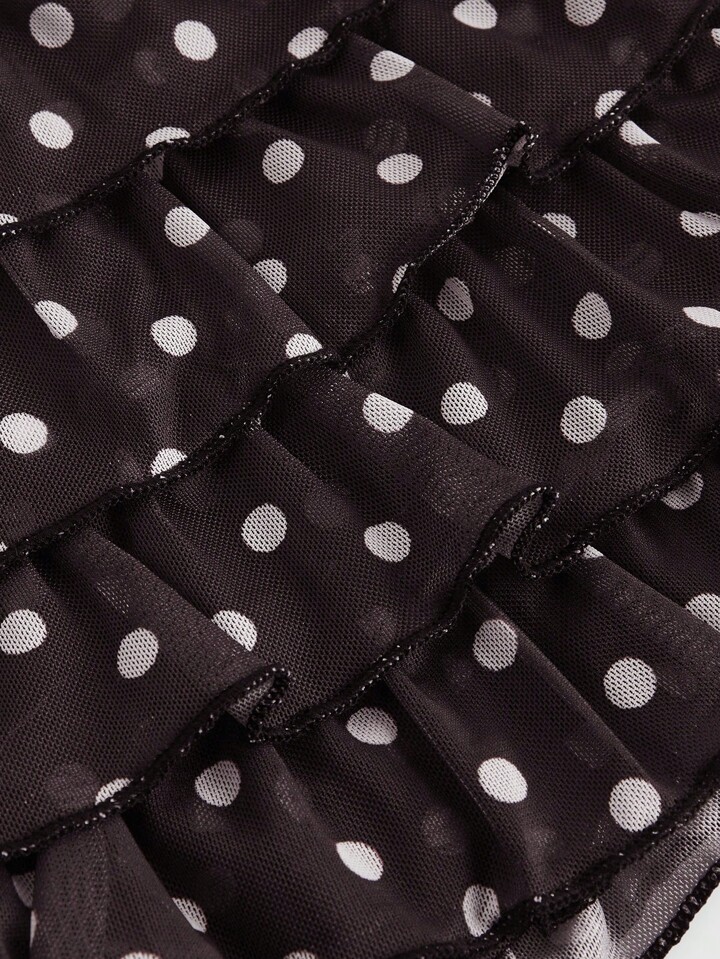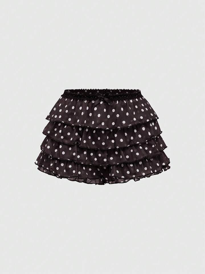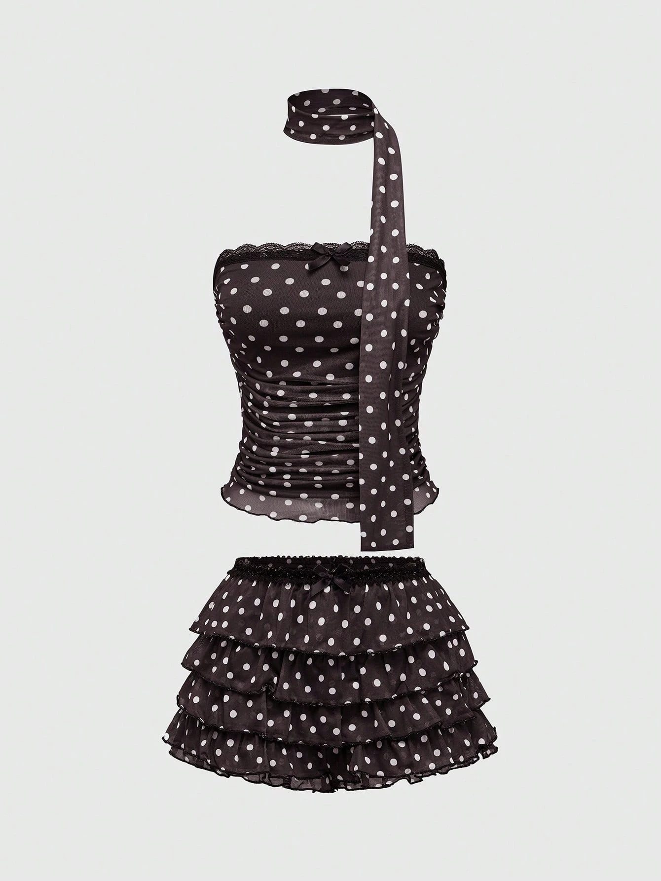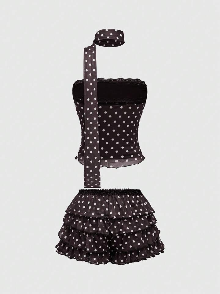 J-Fashion Y2K-Stil Damen 2 Teile Set: Polka Punkt Muster Camisole Crop Top + Rüschen Saum Shorts mit Binde, Sommer Outfit