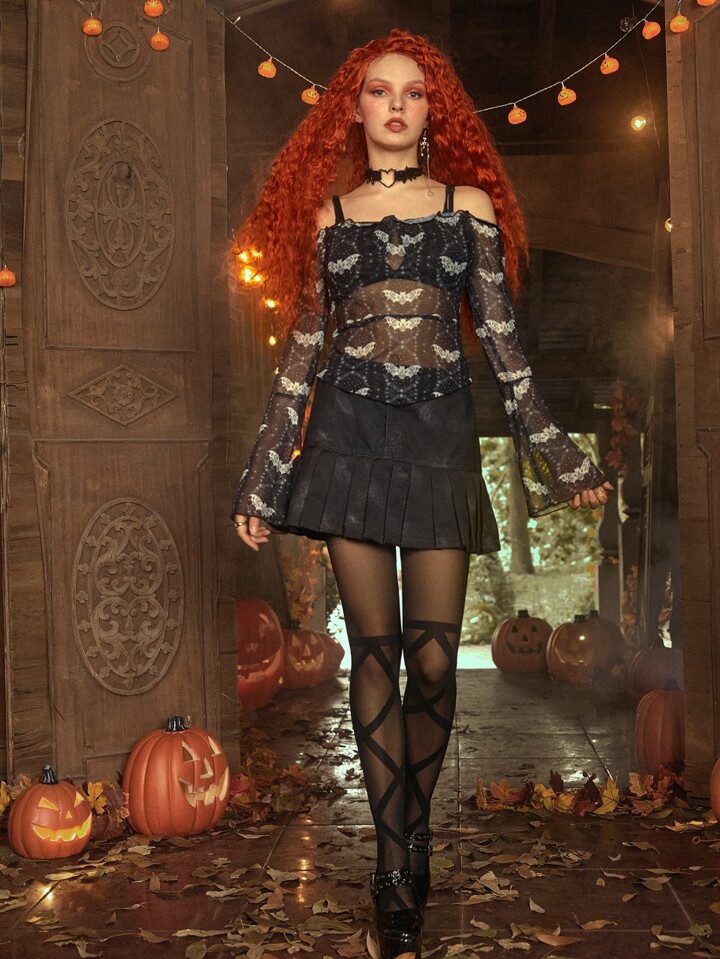 J Marie Creates Top mit Fledermaus Muster, Rüschen, Mesh