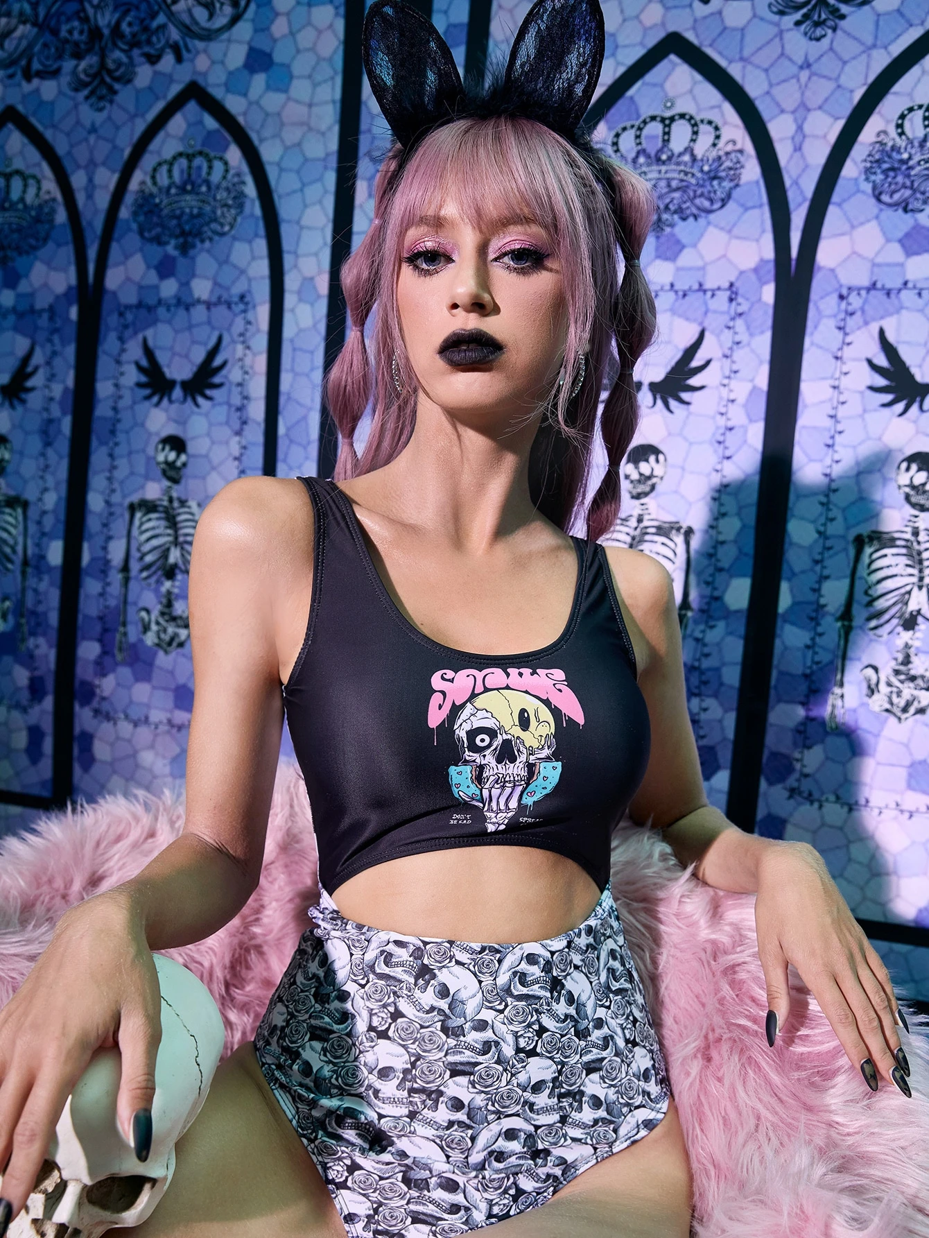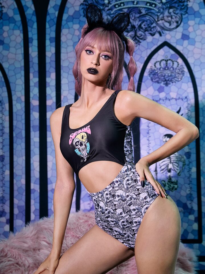 Jena998 Badeanzug mit Buchstabe Schädel & Blume Grafik, Ausschnitt