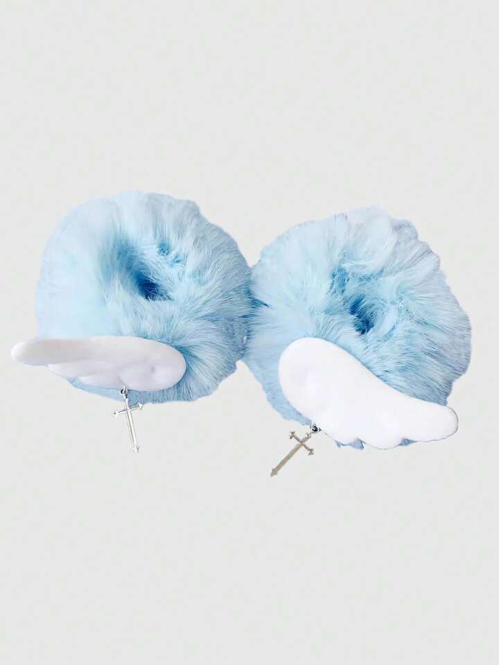 Kawaii 1 hellblauer flauschiger Haarreif mit Engelflügeln und Kreuzanhänger, Y2K Damen Haarband, flauschiges elastisches Haarzubehör