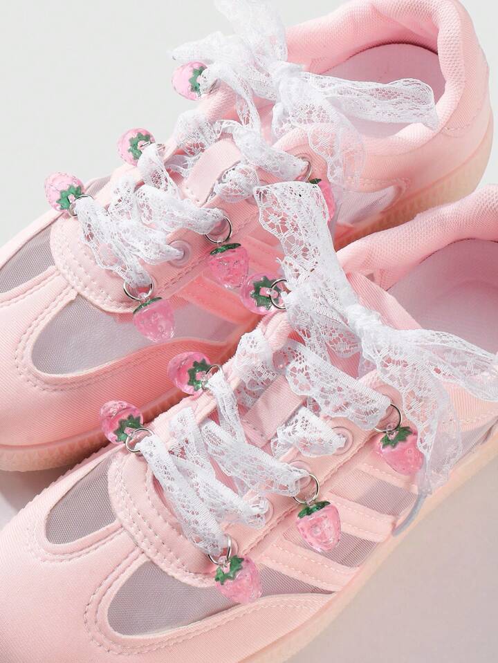 Kawaii 1 Paar koreanischer Stil elegante süße Mode hochwertige weiße Mesh Spitze Schnürsenkel + falsche Harz Erdbeere Anhänger Schuh Dekorationen Kombi Set, geeignet für Frauen, Alltags- oder Feiertagsgeschenk