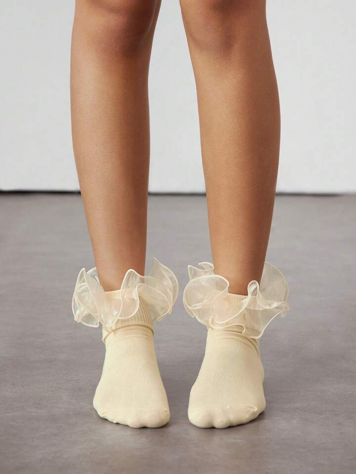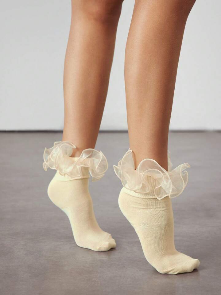 Kawaii 1 Paar Damen Socken mit floraler Spitzenkante, umkehrbar, gelb, knöchellang
