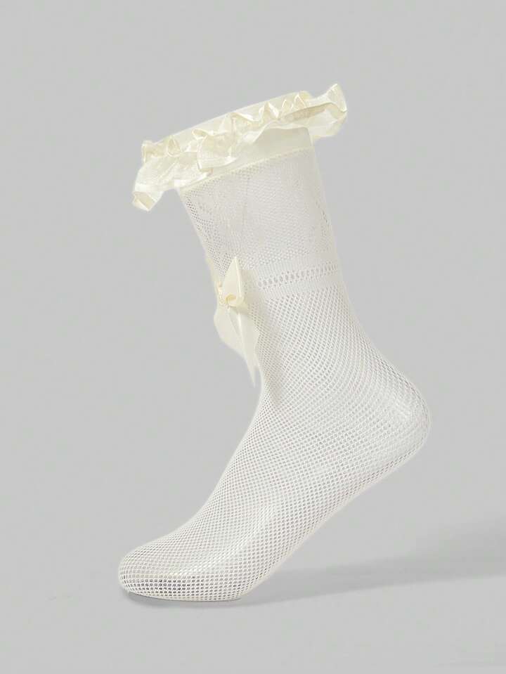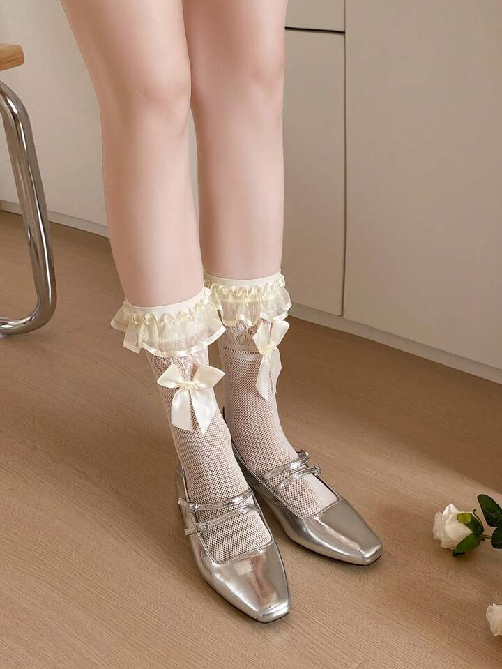 Kawaii 1 Paar Damen Mittelhohe Socken mit Rüschen-Schleifen-Design, passend für Frühling, Sommer, Herbst, College-Stil