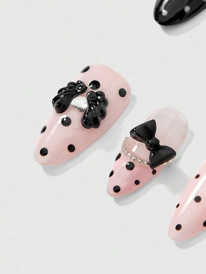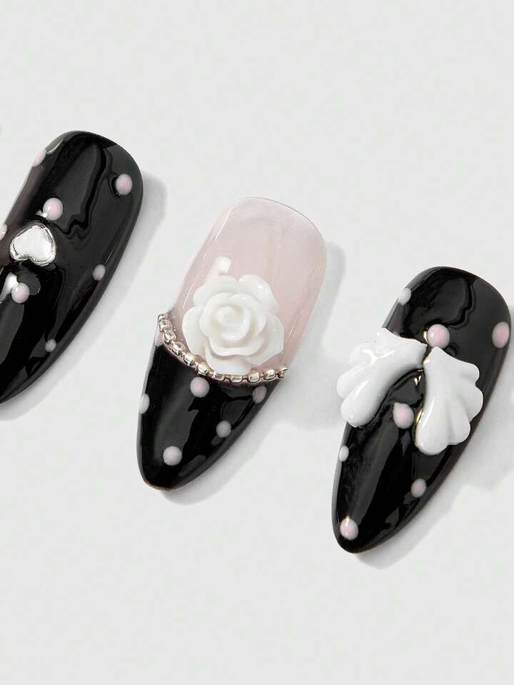 Kawaii 10 Stücke dunkler Stil Flügel, Musiknote, Rose, Schleife Nagelkunst Aufkleber + 3 Stücke doppelseitiger Kleber, Y2K französischer Stil Strass Kette Polka Punkt abnehmbare handbemalte Nagel Aufkleber, geeignet für Feiertage, Partys, Tanzen und den täglichen Gebrauch