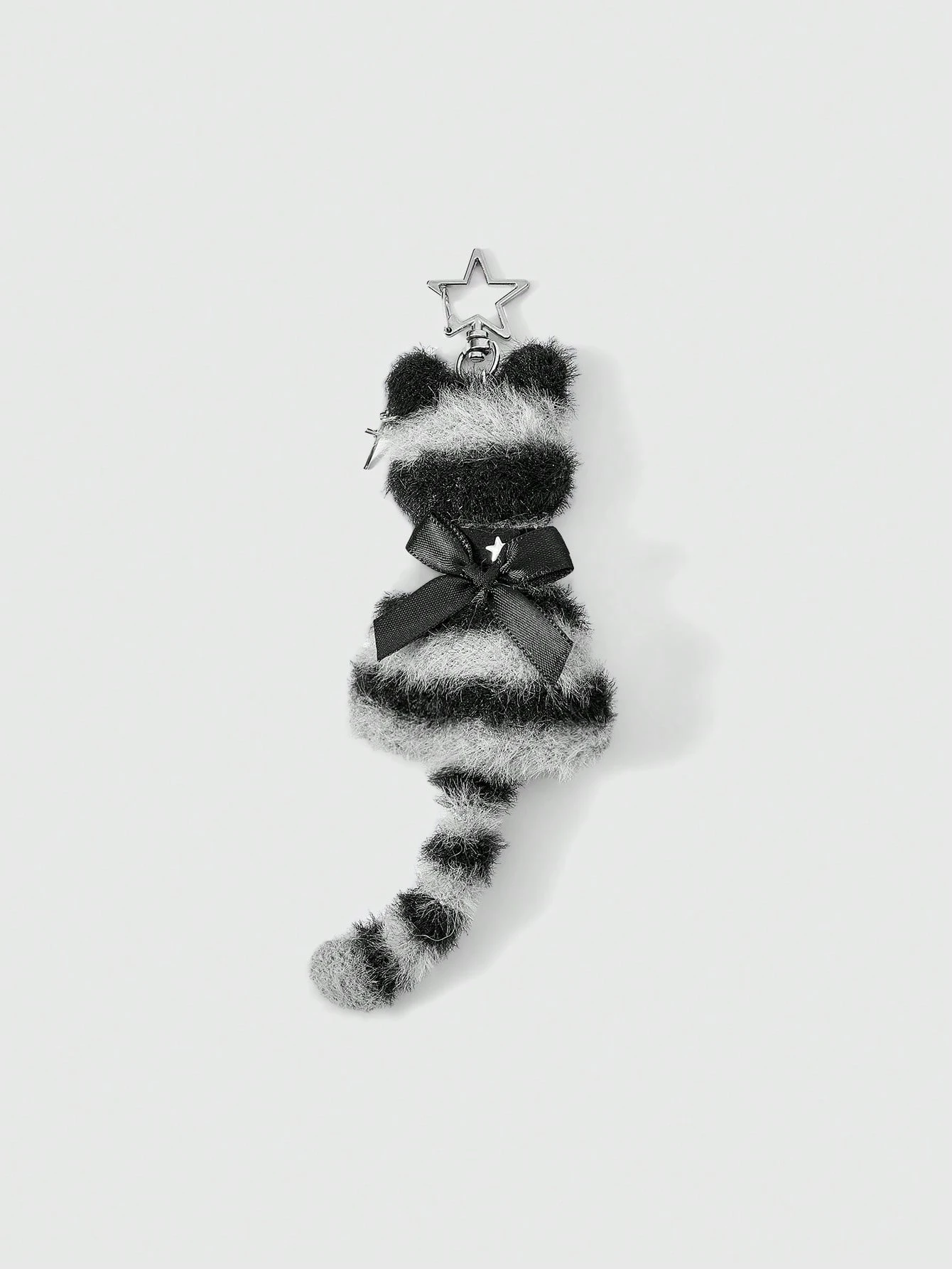 Kawaii 1 Stück Schwarz & Grau Y2K Baddie Retro Punk Stil gestreifter Metall Nieten Pentagramm Plüsch Katze Multifunktions Schlüsselanhänger, geeignet für Taschen, Hosen, Schule, Lässig ausflüge, Dates