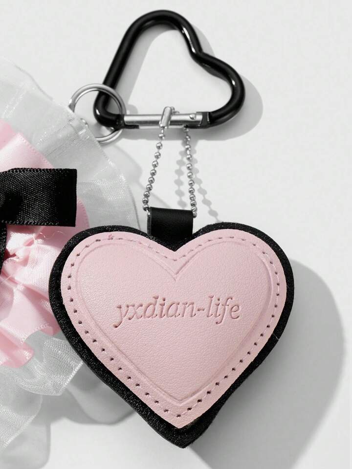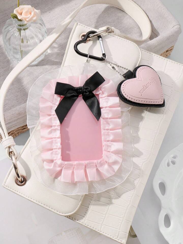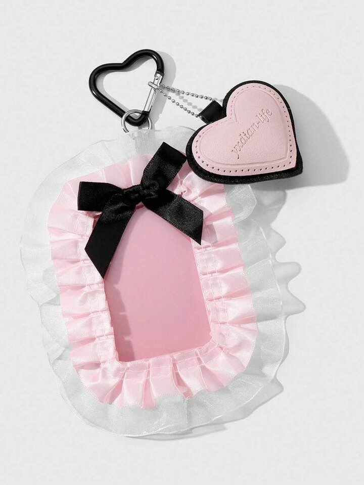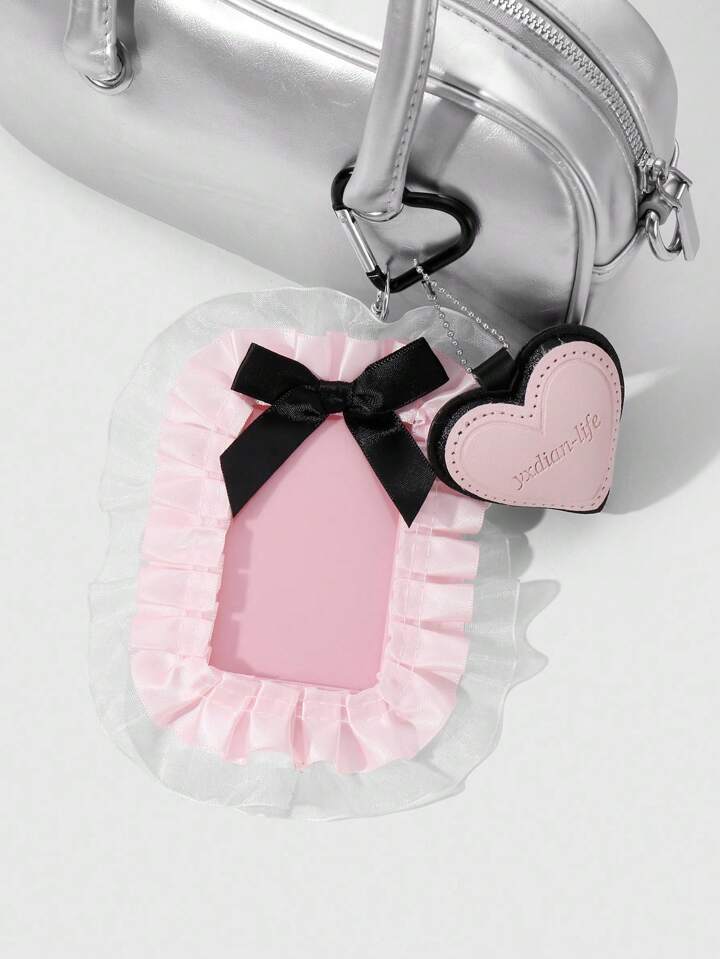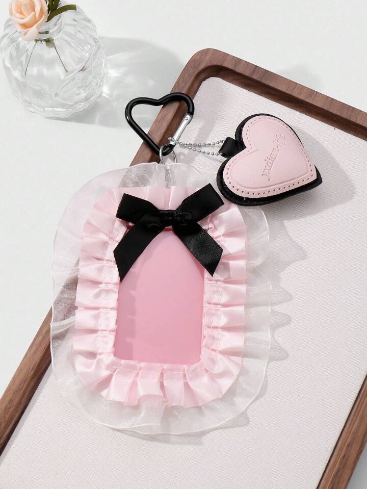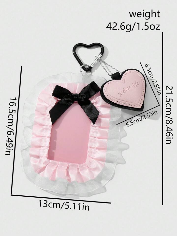 Kawaii 1 Stück süßer, modischer, hochqualitativer rosa Leder-Herz-Spitze-Mesh-Schleife-Kartenhalter, DIY Herz Schlüsselanhänger Taschendekoration, geeignet für Büromitarbeiter, Studenten, Alltagskleidung, Geschenke