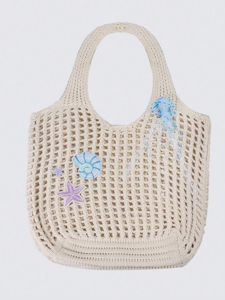 Kawaii 1 Stück bestickte Seestern Deko Damen Umhängetasche, gefälschte Seetang gestrickte Mesh Strandtasche
