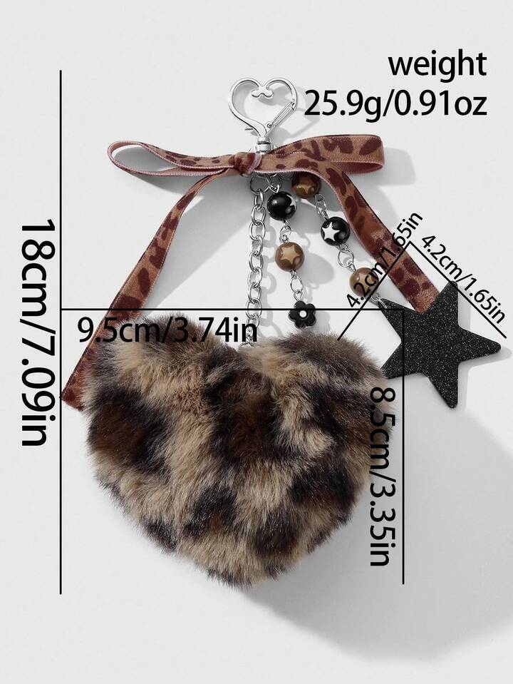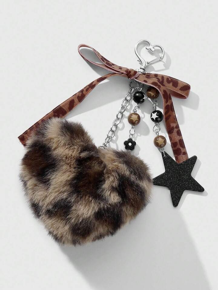 Kawaii 1 Stück modischer, retro personalisierter Acryl-Stern-Blumen-Schlüsselanhänger mit braunem Kunstfell-Leopardenmuster und Herz-Schleife, geeignet für Frauen, Alltagsmode, Urlaubsgeschenk