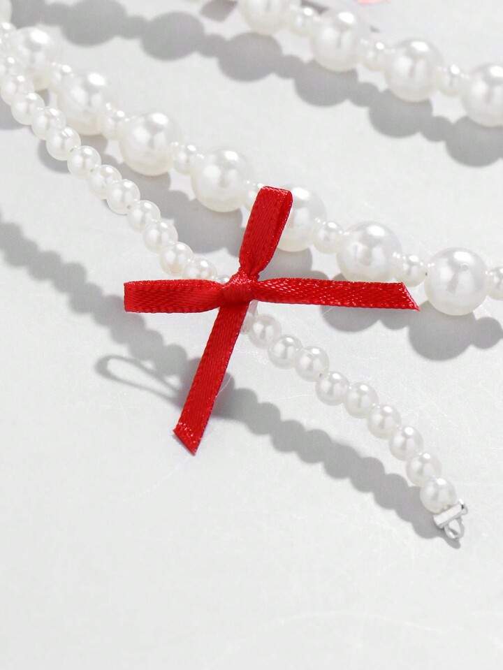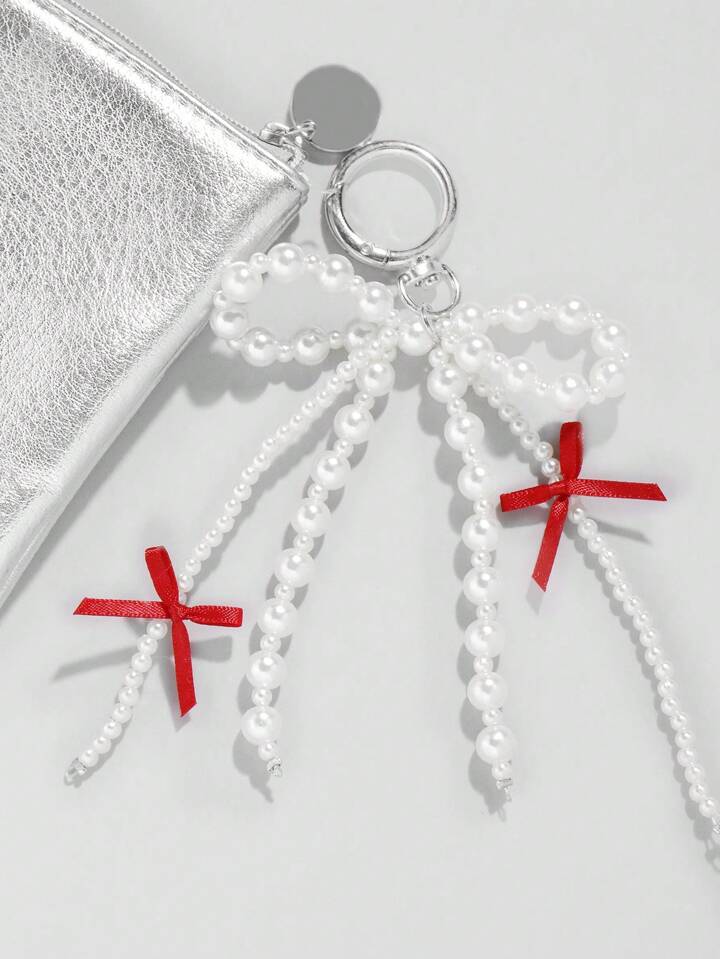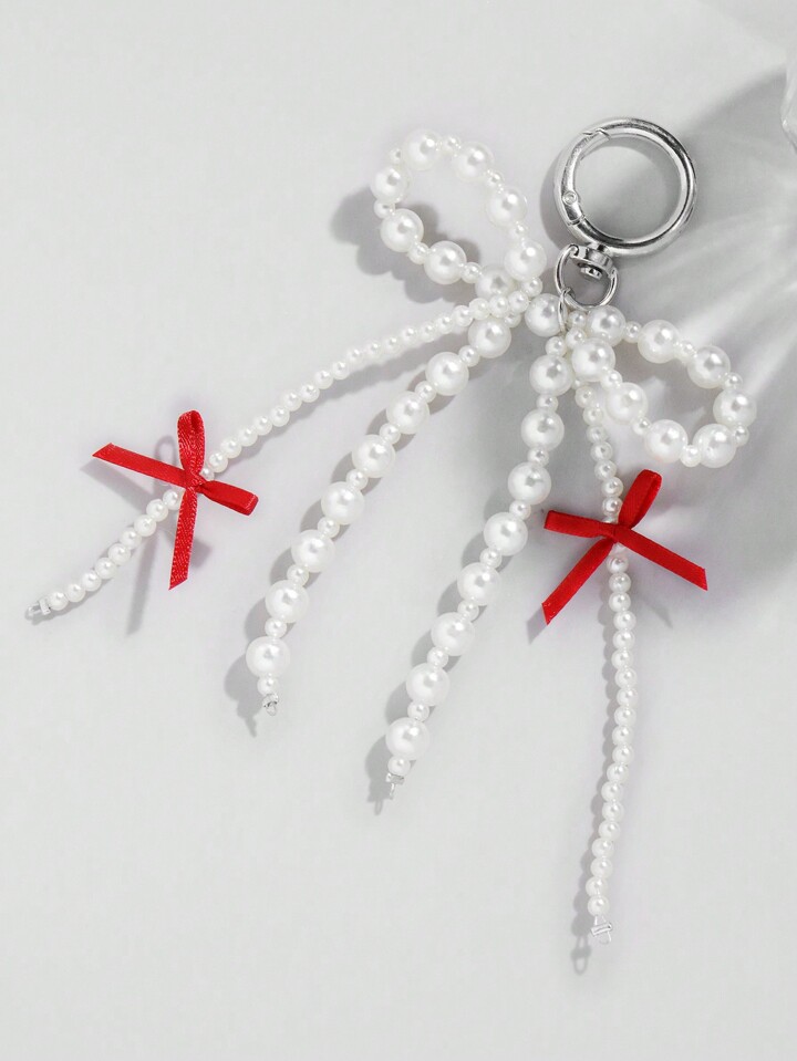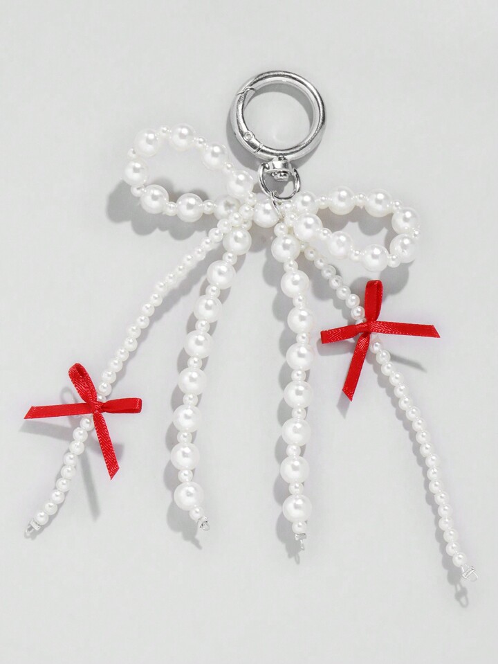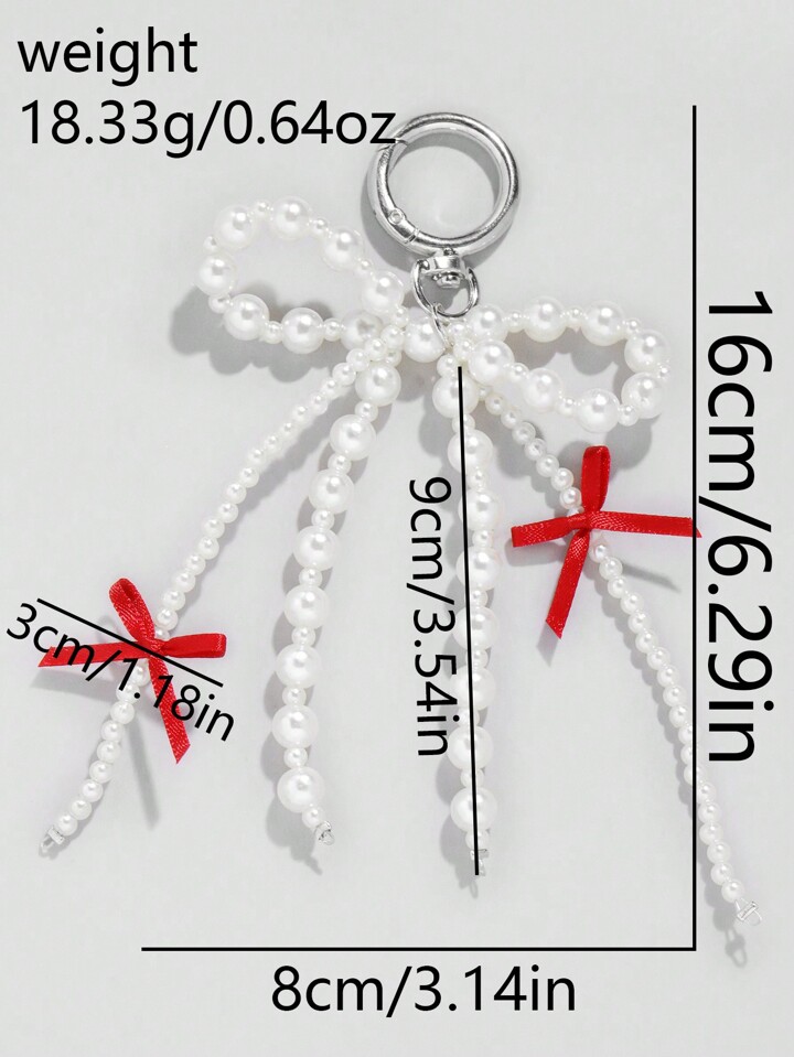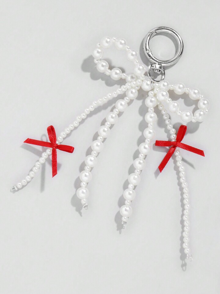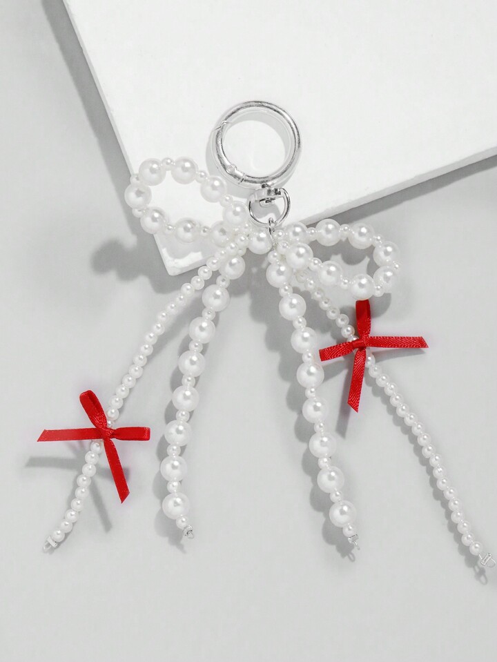 Kawaii 1 Stück koreanischer Stil süßer und cooler Schlüsselanhänger mit Imitatperl-Anhänger und 2 Stücke Weinrot & Kirschrot Schleifenband, kann als Taschenanhänger verwendet werden