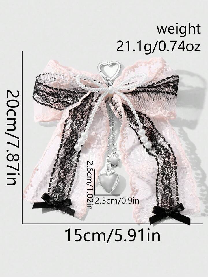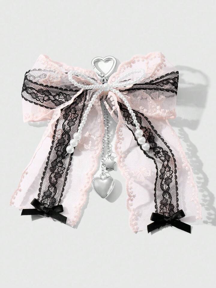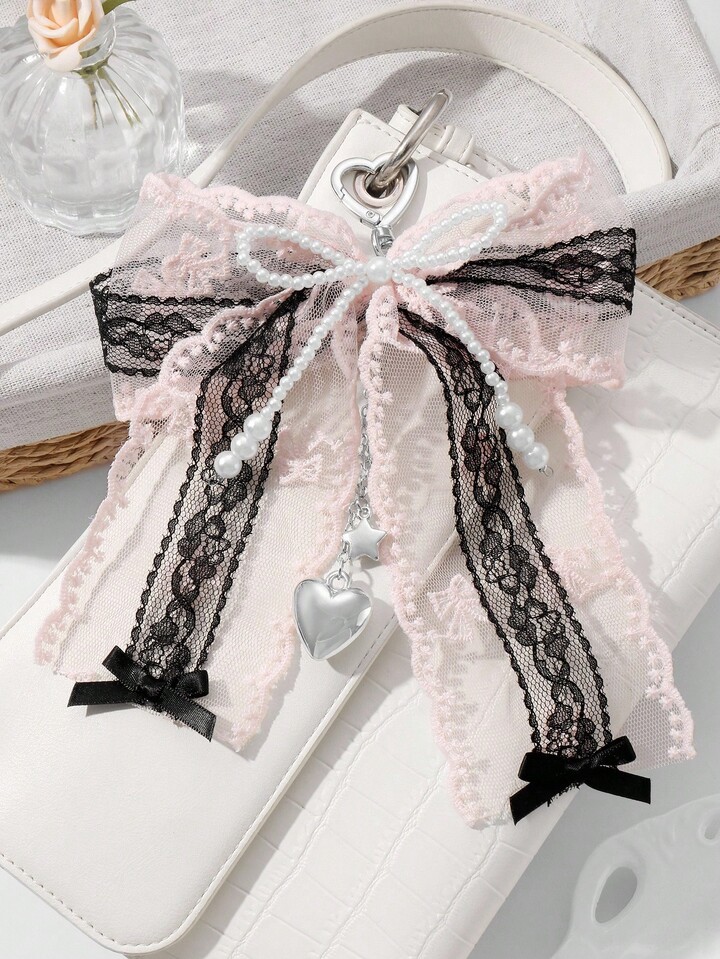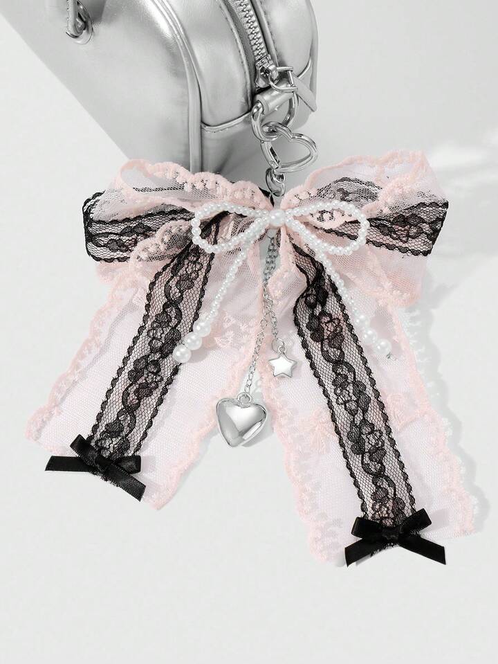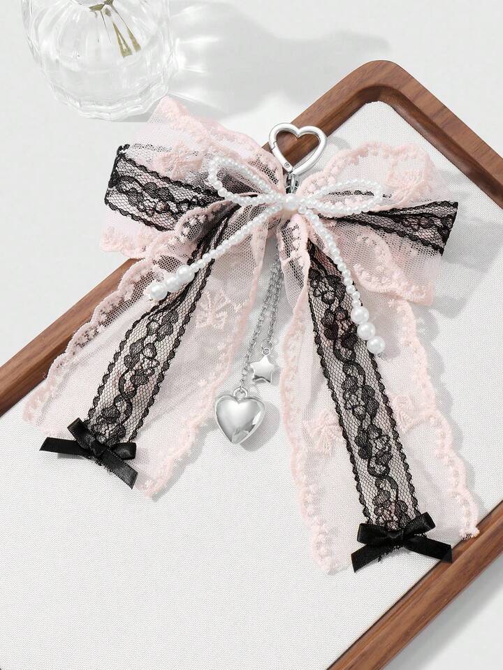 Kawaii 1 Stück Retro handgemachter weißer Perlen, rosa & schwarzer Spitzen-Schleife, mehrlagige Kette mit CCB Herz & Stern DIY Schlüsselanhänger/Taschenanhänger, stilvoll & elegant, geeignet für Frauen/Mädchen, tolles Geschenk