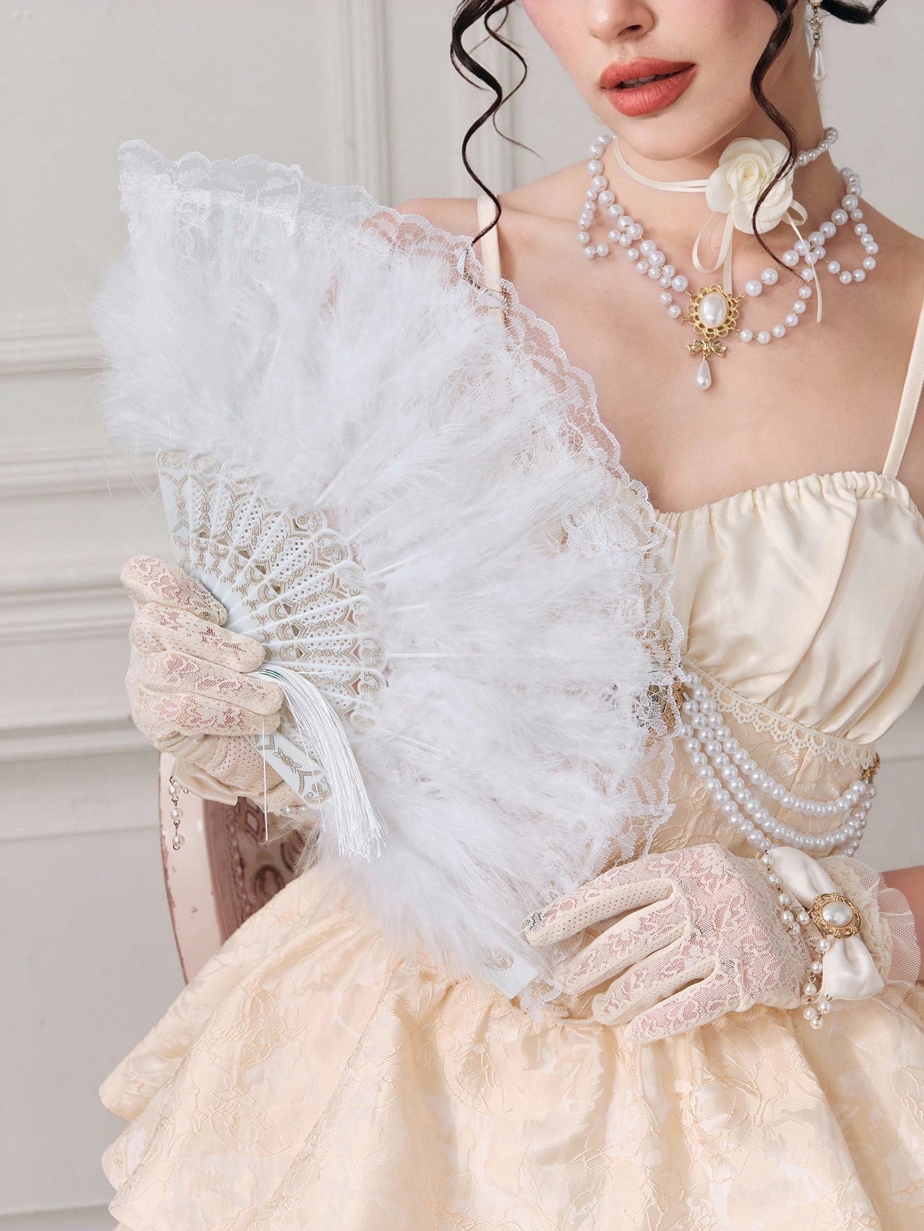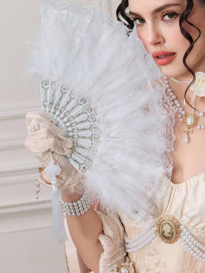Kawaii 1 Stück Fächer im Rokoko-Palast-Stil mit Federn & Spitze (Federnimitat), vintage goldfarbenes bedrucktes Design mit Anhänger, tragbarer Tänzerfächer