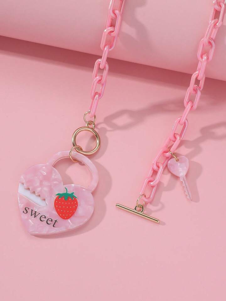 Kawaii 1 Stück Romantische Valentinstag Halskette Mit Schlüssel- Und Schlossanhänger In Erdbeer- Und Herzform Mit Karabinerverschluss, Damen