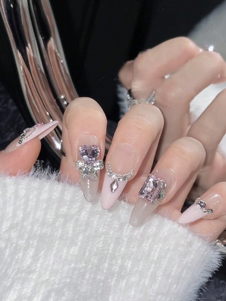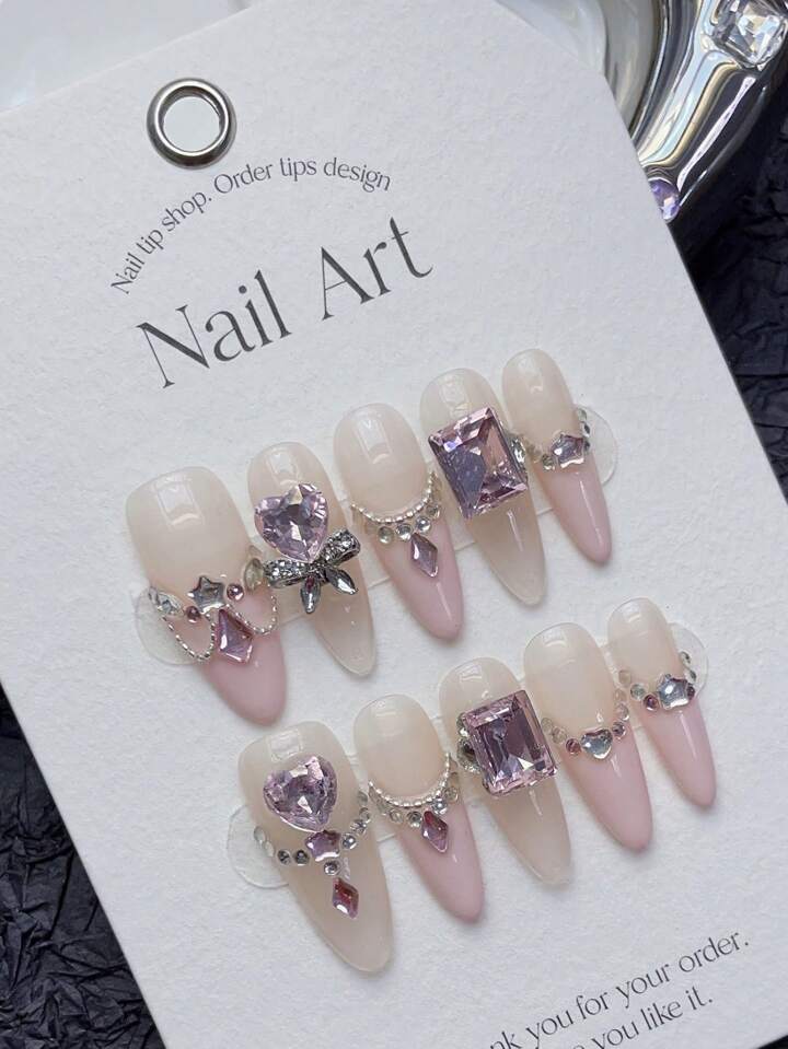Kawaii 1 Set/10 Stück Lange Mandelform-full Cover French Style Nail Art Mit Strass Dekoration