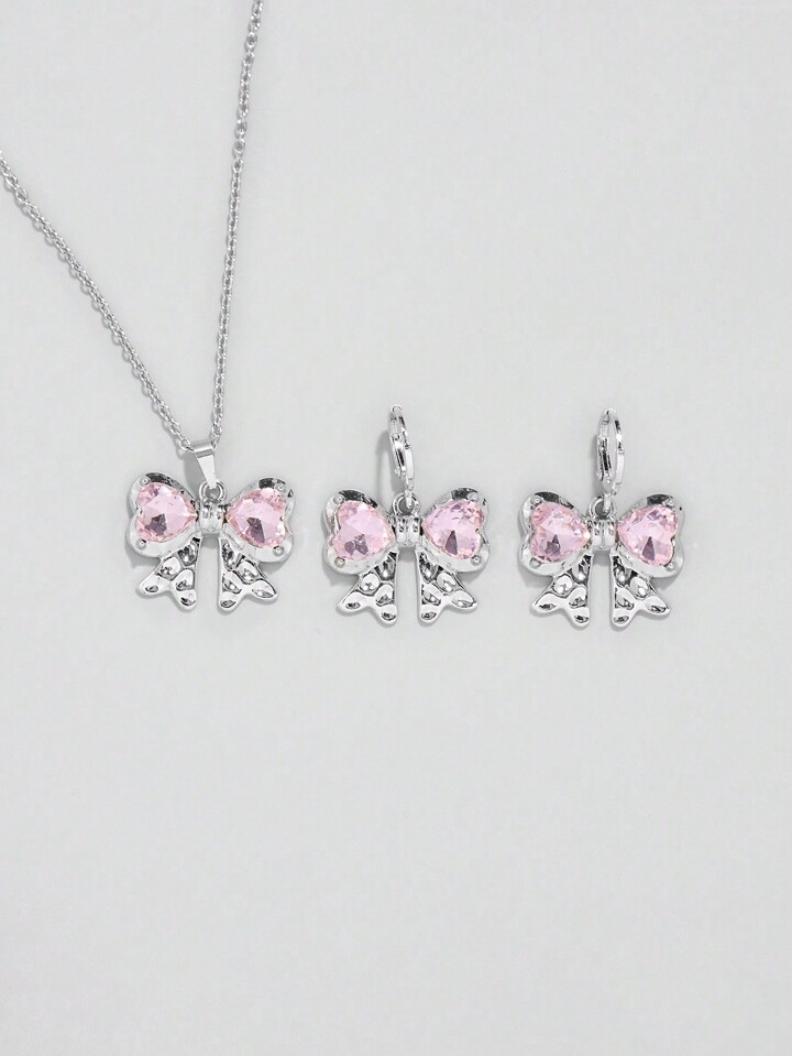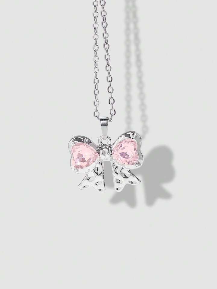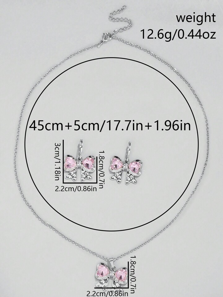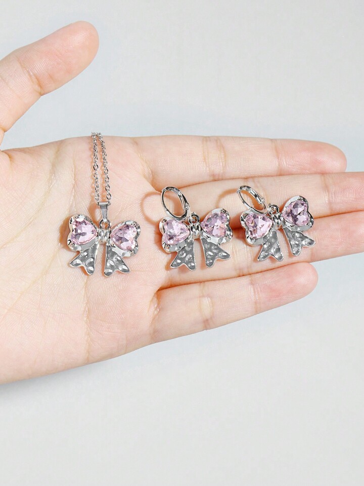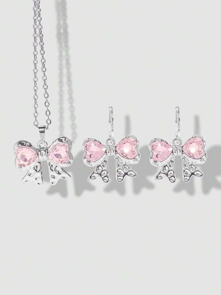 Kawaii 1 Set Mädchens rosa herzförmiger Glas Kristall Anhänger Edelstahl Kette und Kupfer Ohrringe Set mit Schleifen Design
